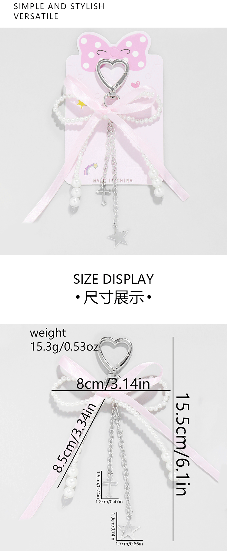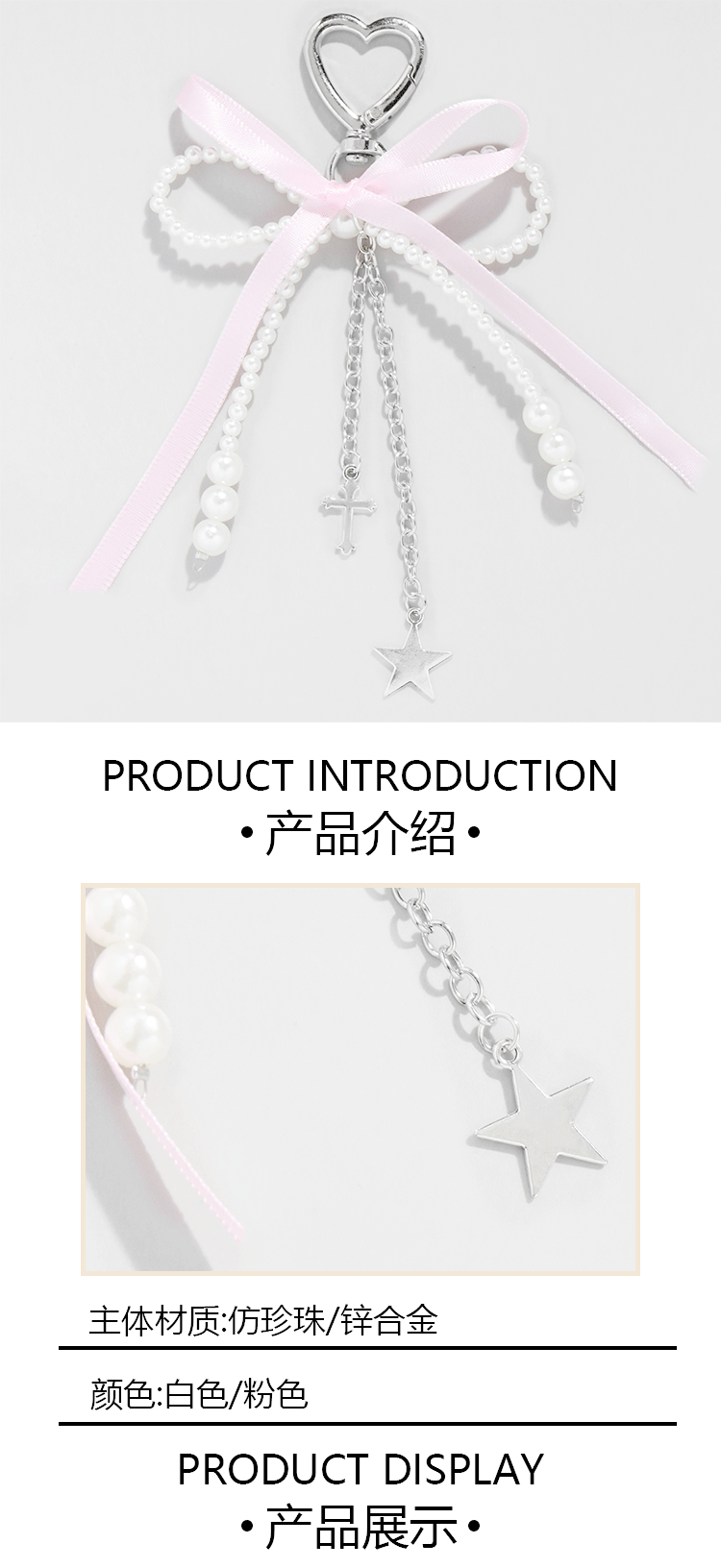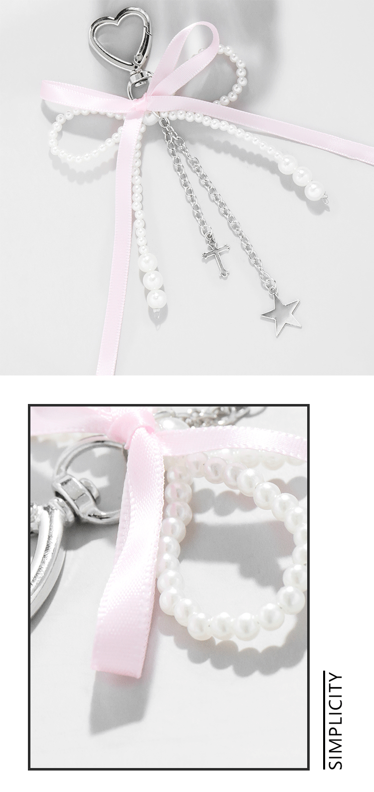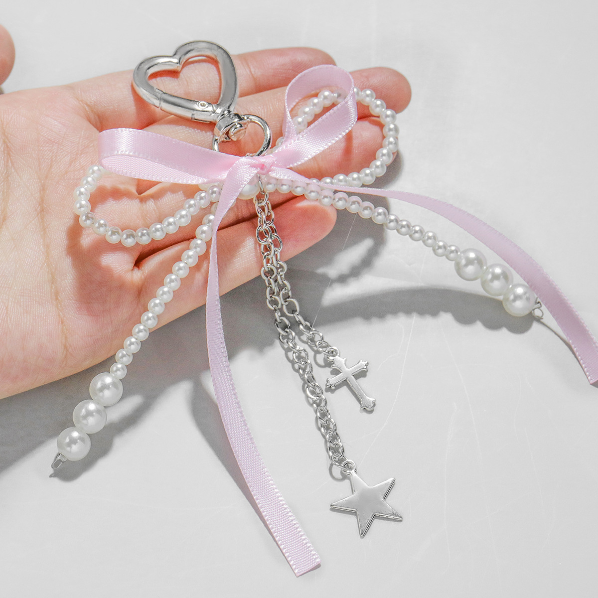 pink ribbon imitation pearl bow heart keychain 1