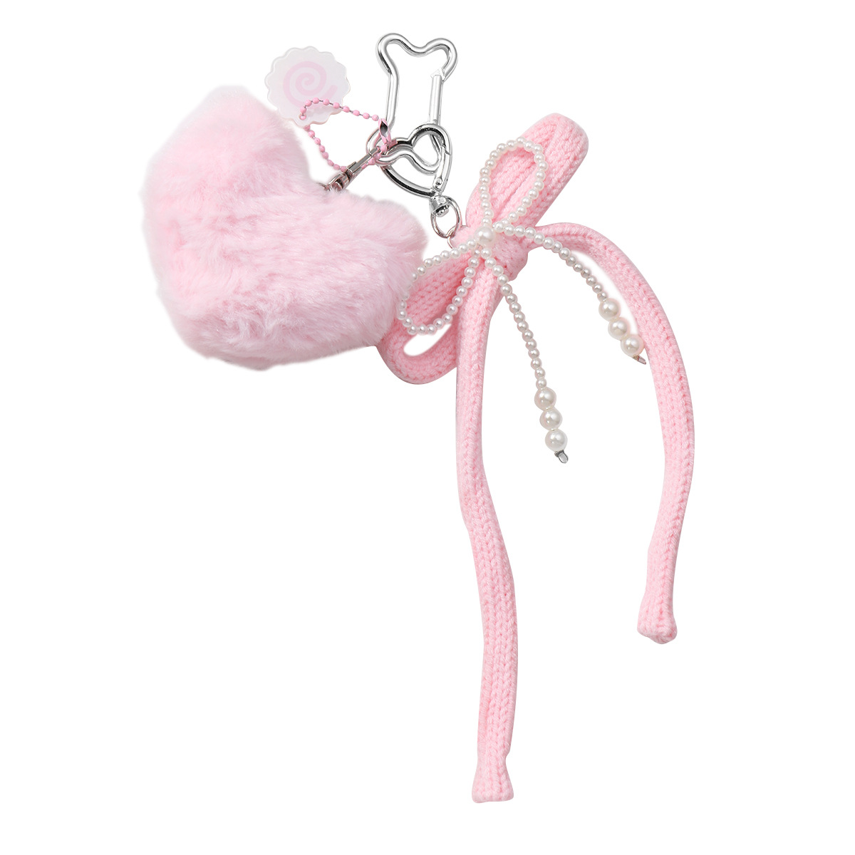 pink plush loving heart pearl bow keychain