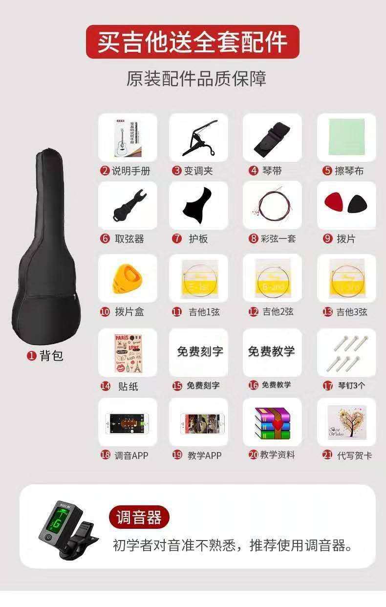 | full set of accessories + guitar bag + teaching materials + electronic tuner | CN¥ 125.54 | 999999 piece available |