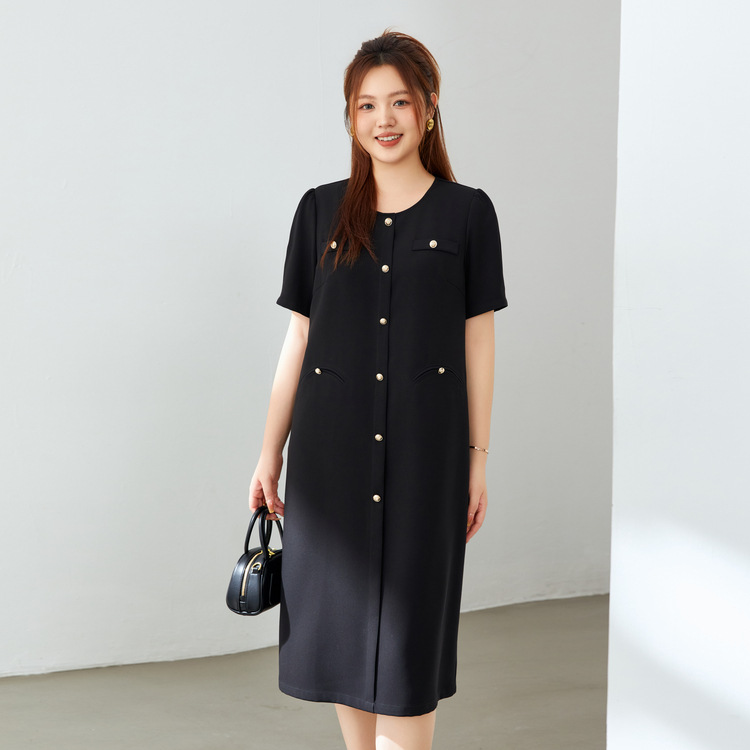 qlx plus size women's clothing high-grade socialite temperament crew neck simple black dress fat mm2024 summer new