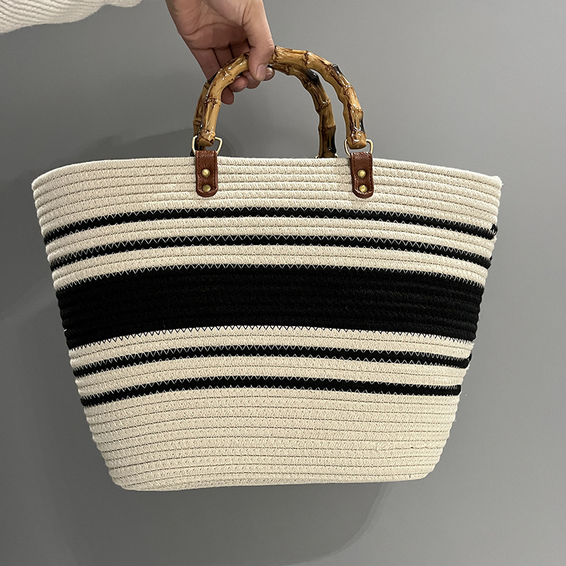wholesale bamboo handle woven handbag 2023 spring and summer new striped minimalist portable tote bag shoulder bag