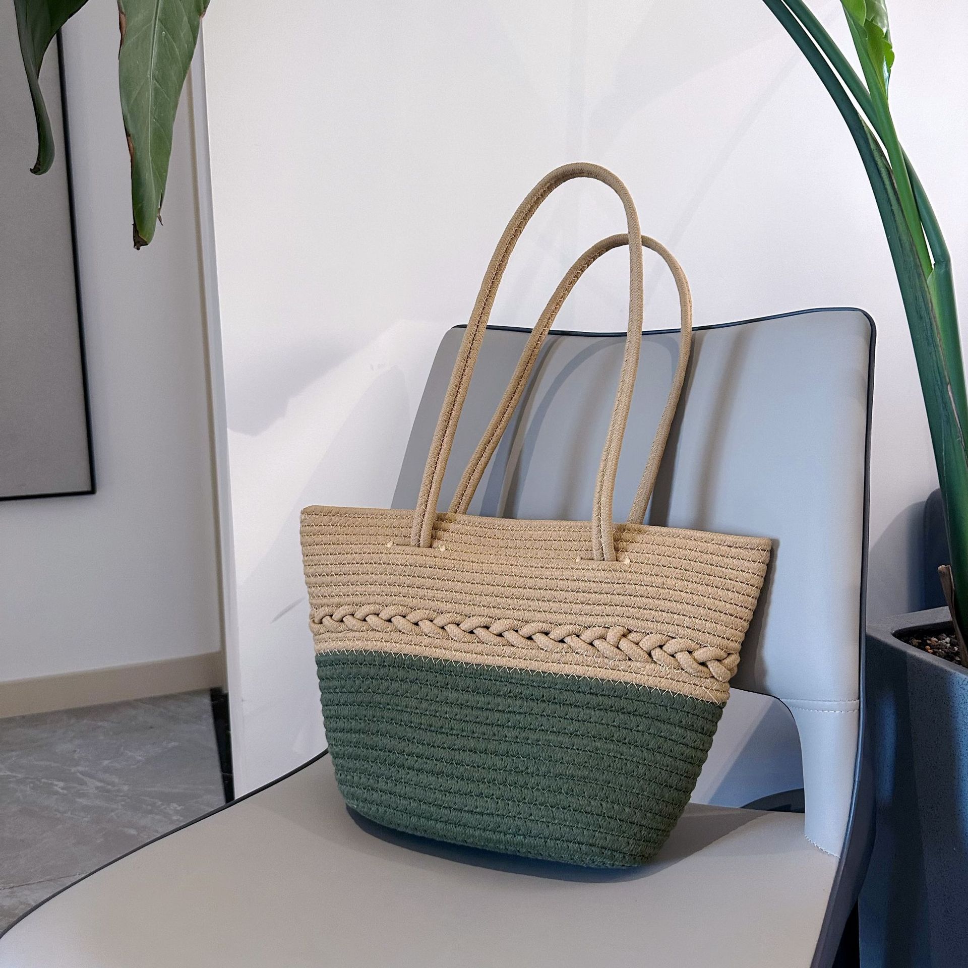 summer high-grade niche cotton rope braided bag portable beach bag women's bag color matching zip one shoulder vegetable basket stitching