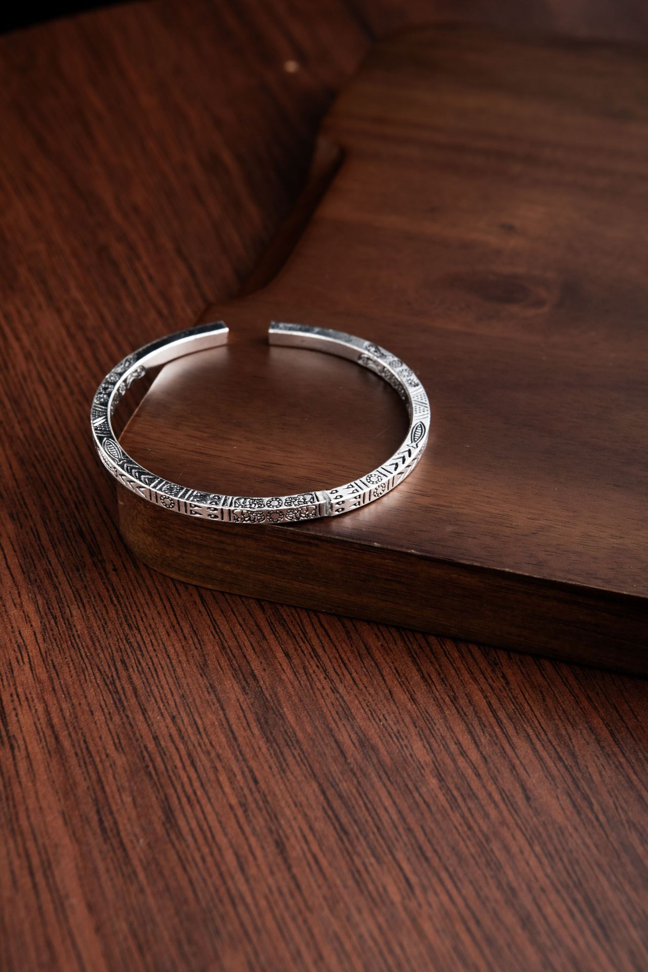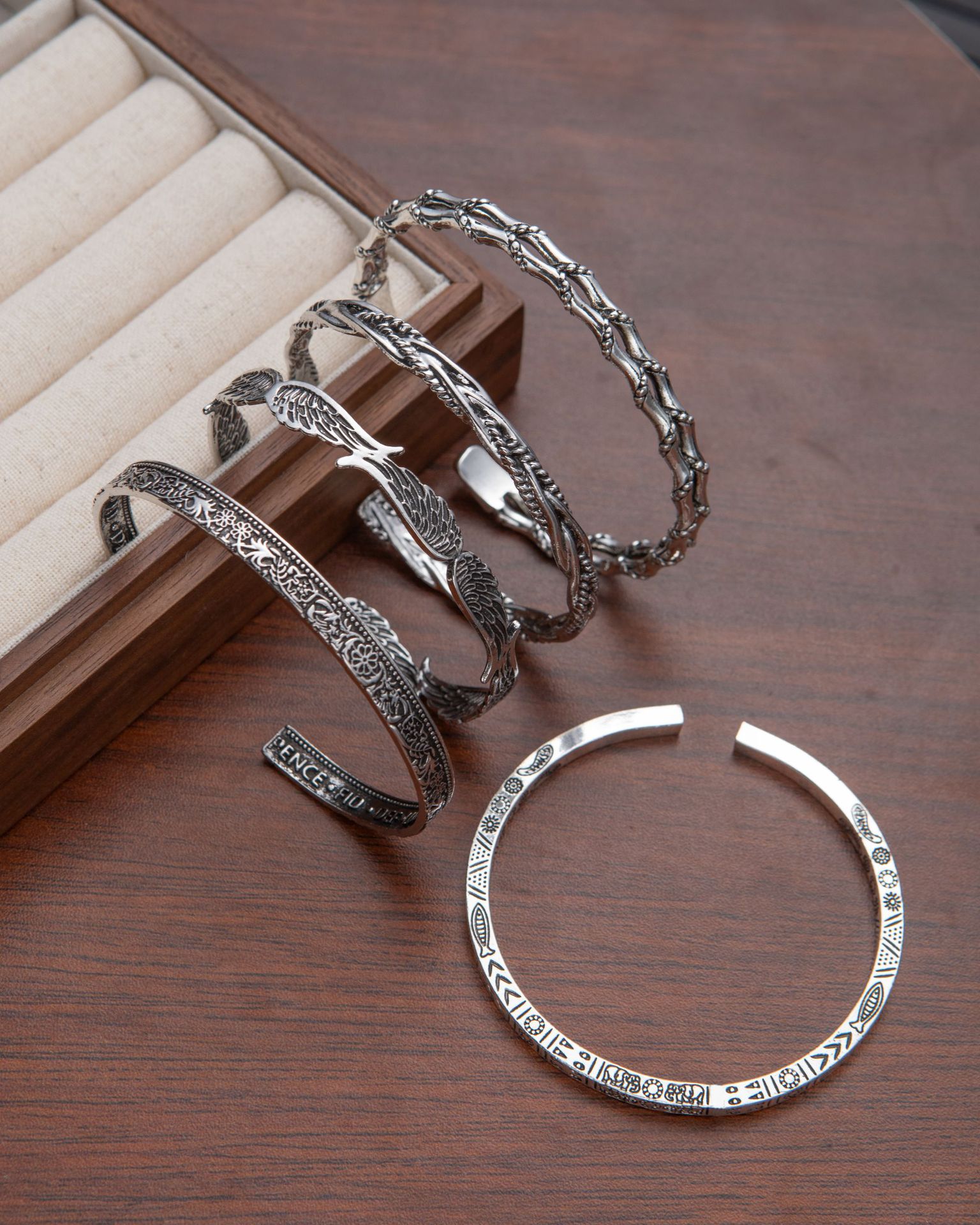 Cross-border open-mouth bracelets for men and women, metal antique silver bracelet, retro and simple bamboo section feather carving jewelry wholesale supply