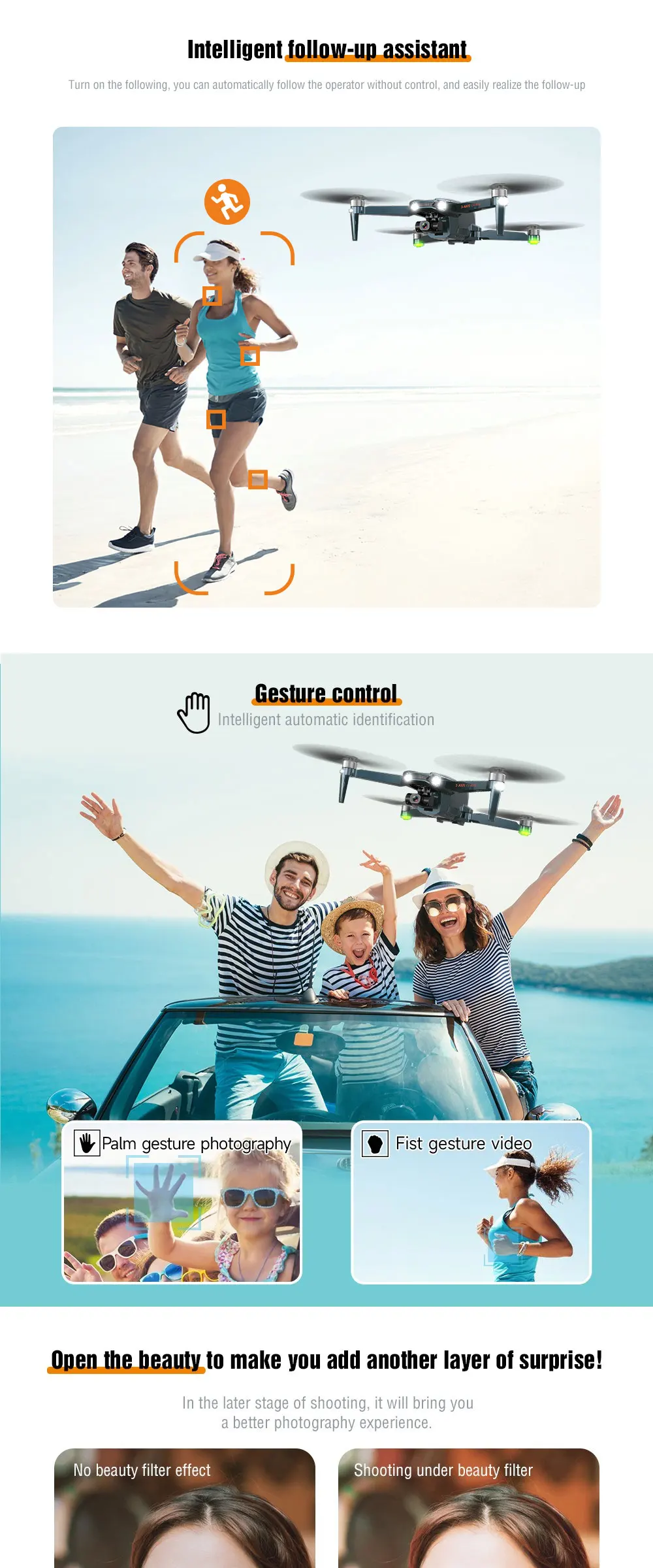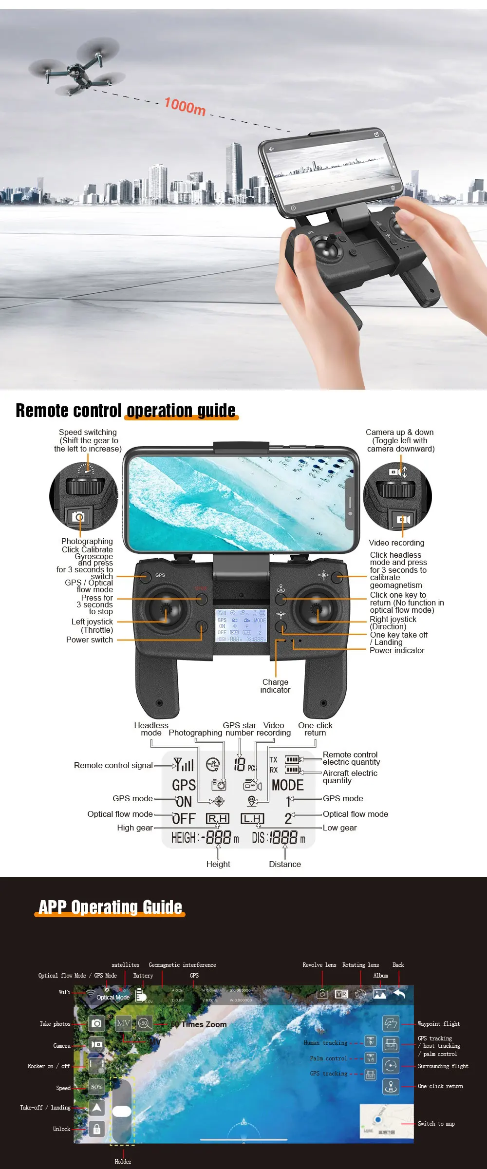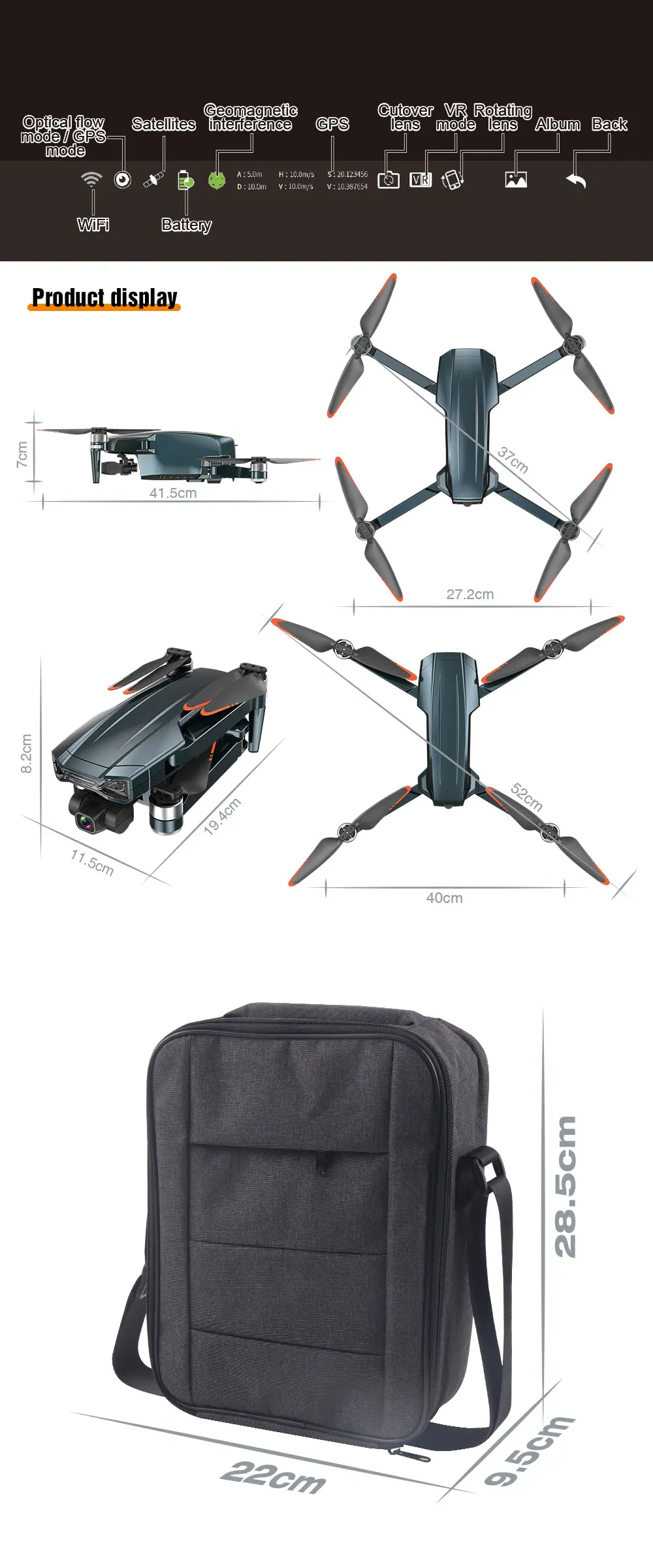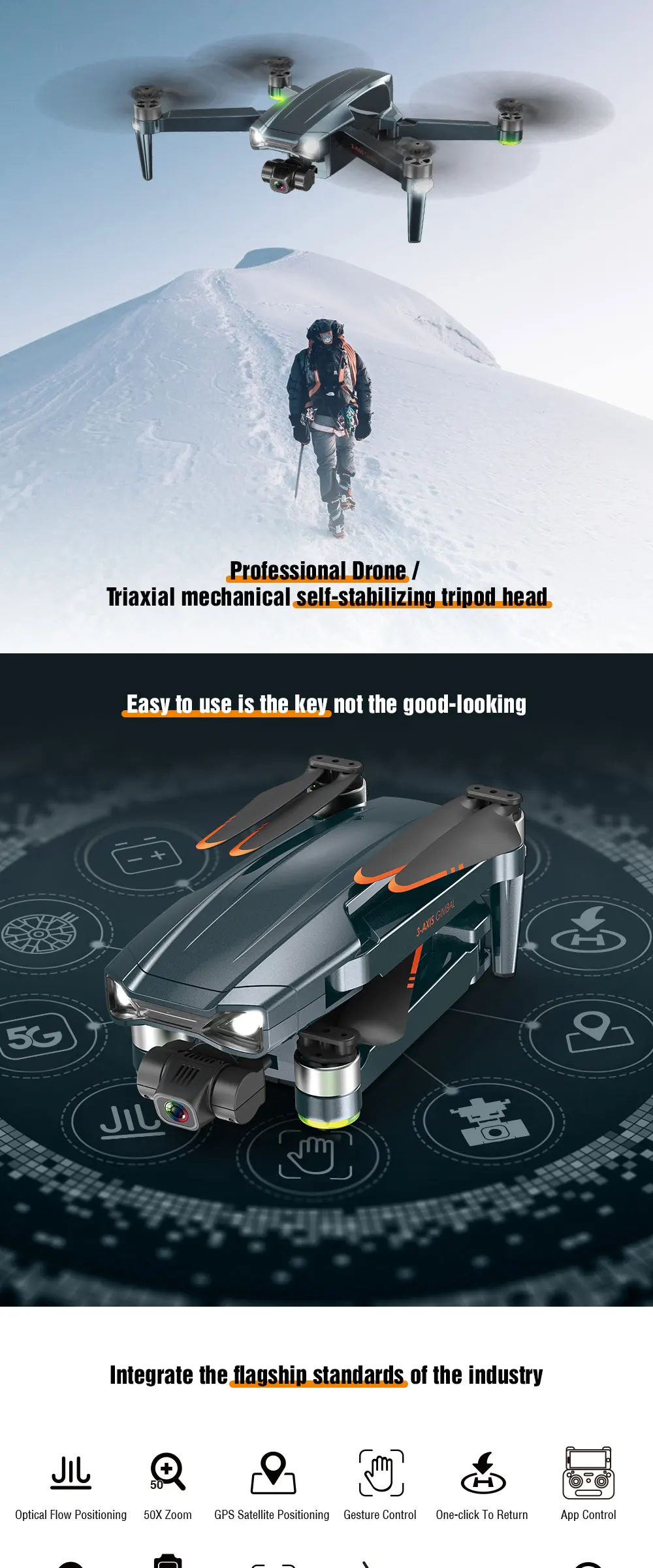 Why hot sales | Fuselage folding, One-key take-off, One-key landing, Fixed height hovering,Optical flow fixed height, Triaxial self-stabilizing pan/tilt, WiFi connection,APP control, Gesture photography, Gesture video Recording, GPS following,Image following, Palm control (Up, Down, Left and Right), Trajectory flight,Fixed-point surround, Speed adjustment, Real-time transmission, MV picture and video sharing, GPS one-key return |
