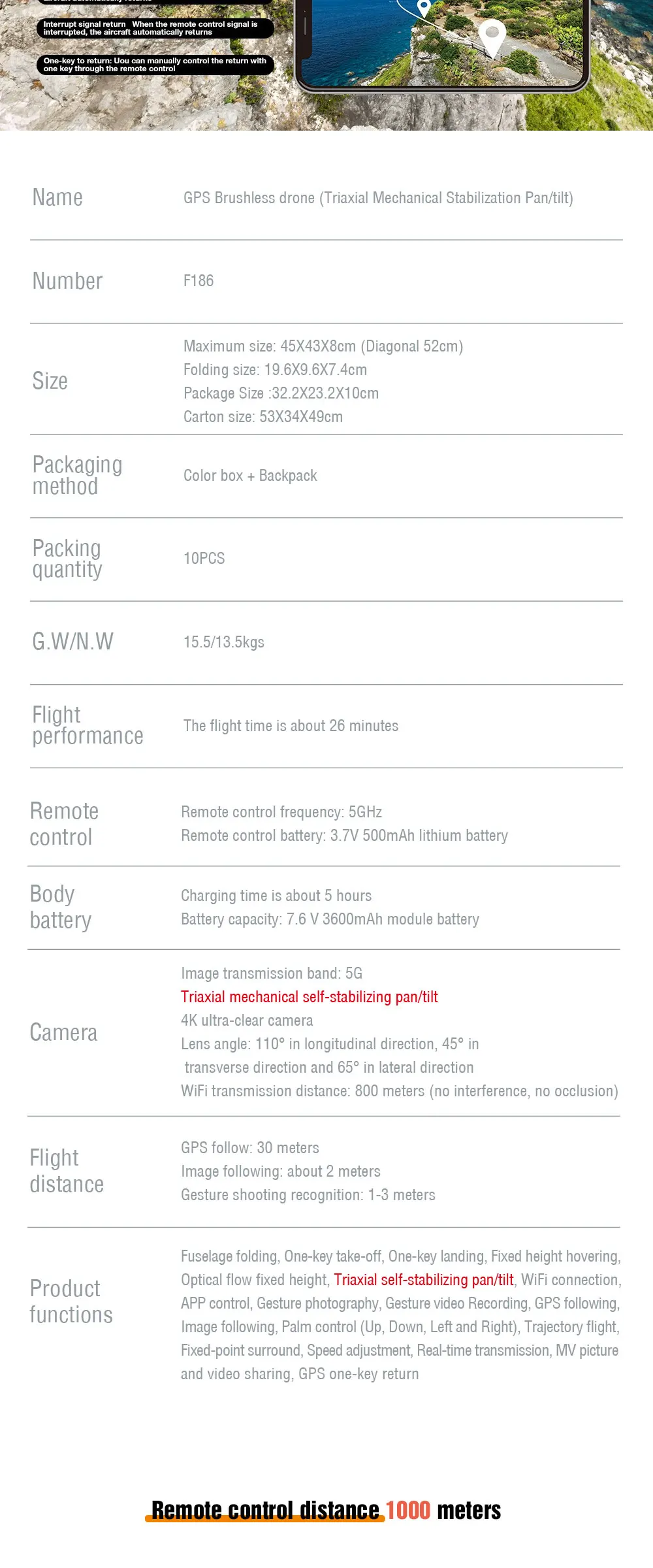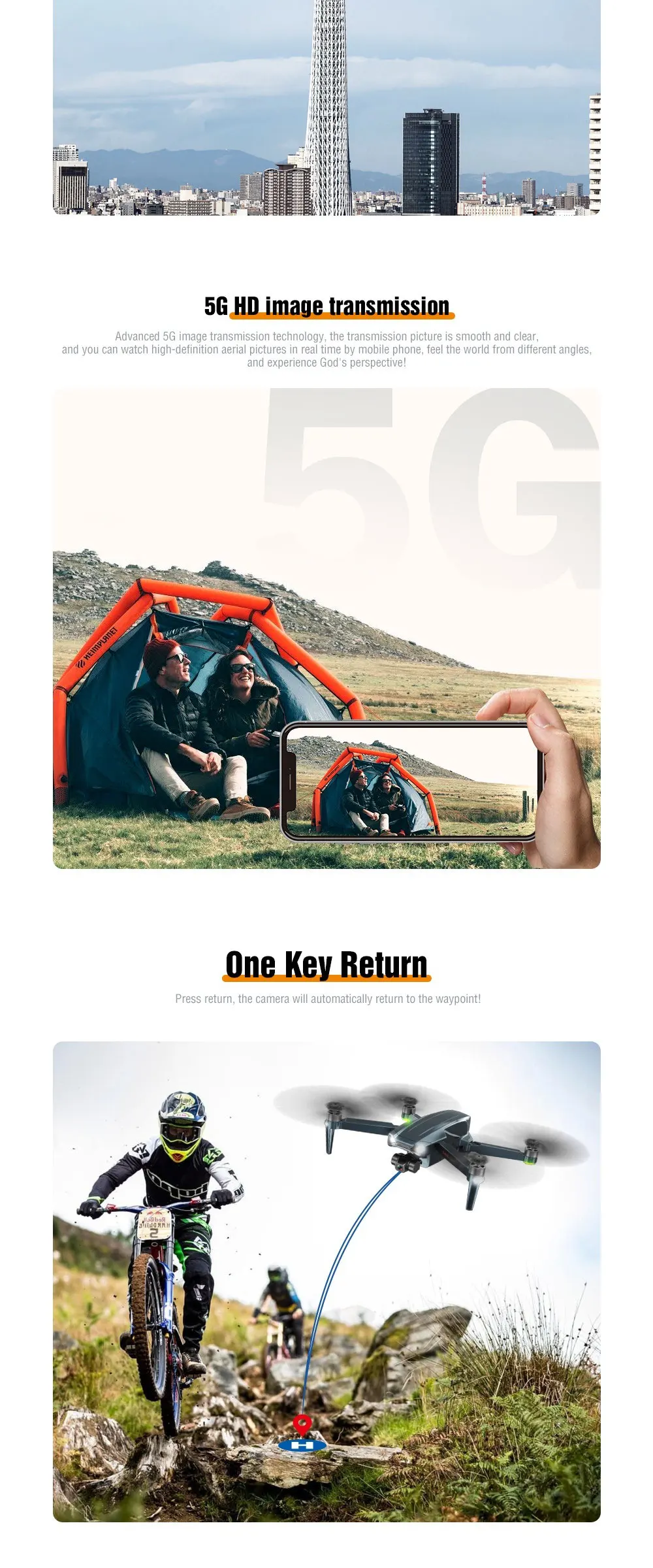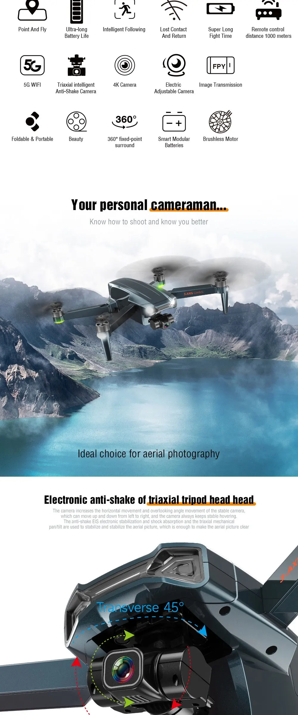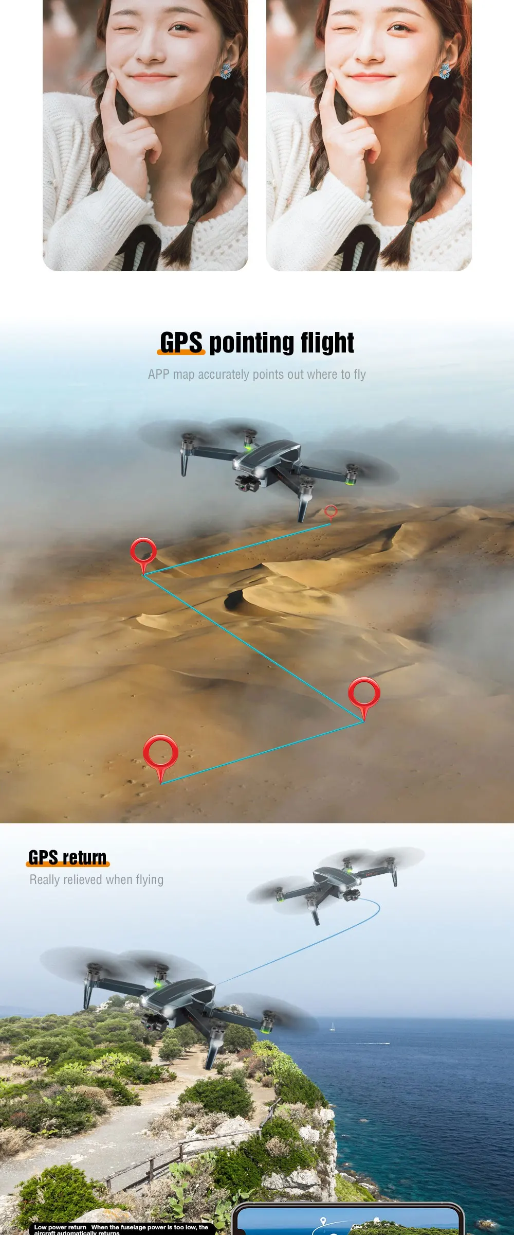 Why hot sales | Fuselage folding, One-key take-off, One-key landing, Fixed height hovering,Optical flow fixed height, Triaxial self-stabilizing pan/tilt, WiFi connection,APP control, Gesture photography, Gesture video Recording, GPS following,Image following, Palm control (Up, Down, Left and Right), Trajectory flight,Fixed-point surround, Speed adjustment, Real-time transmission, MV picture and video sharing, GPS one-key return |