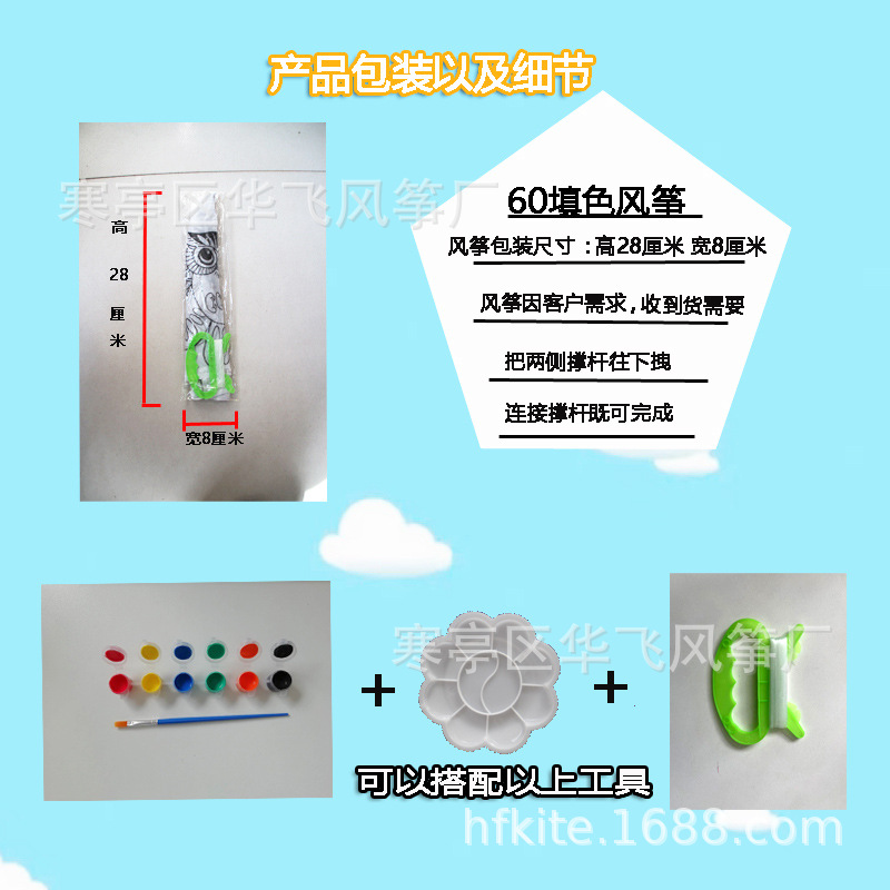| 1.15 m color filling kite mixed hair +30 m cotton thread +6 color paint + brush + palette (one set) | CN¥ 4.02 | 888888 piece available |