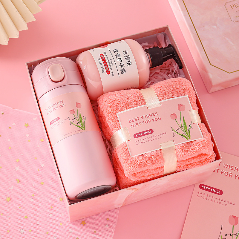 [pink] thermos cup + hand cream + towel