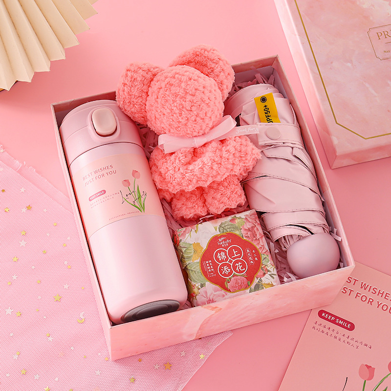 [pink] thermos cup + umbrella + bear towel + soap