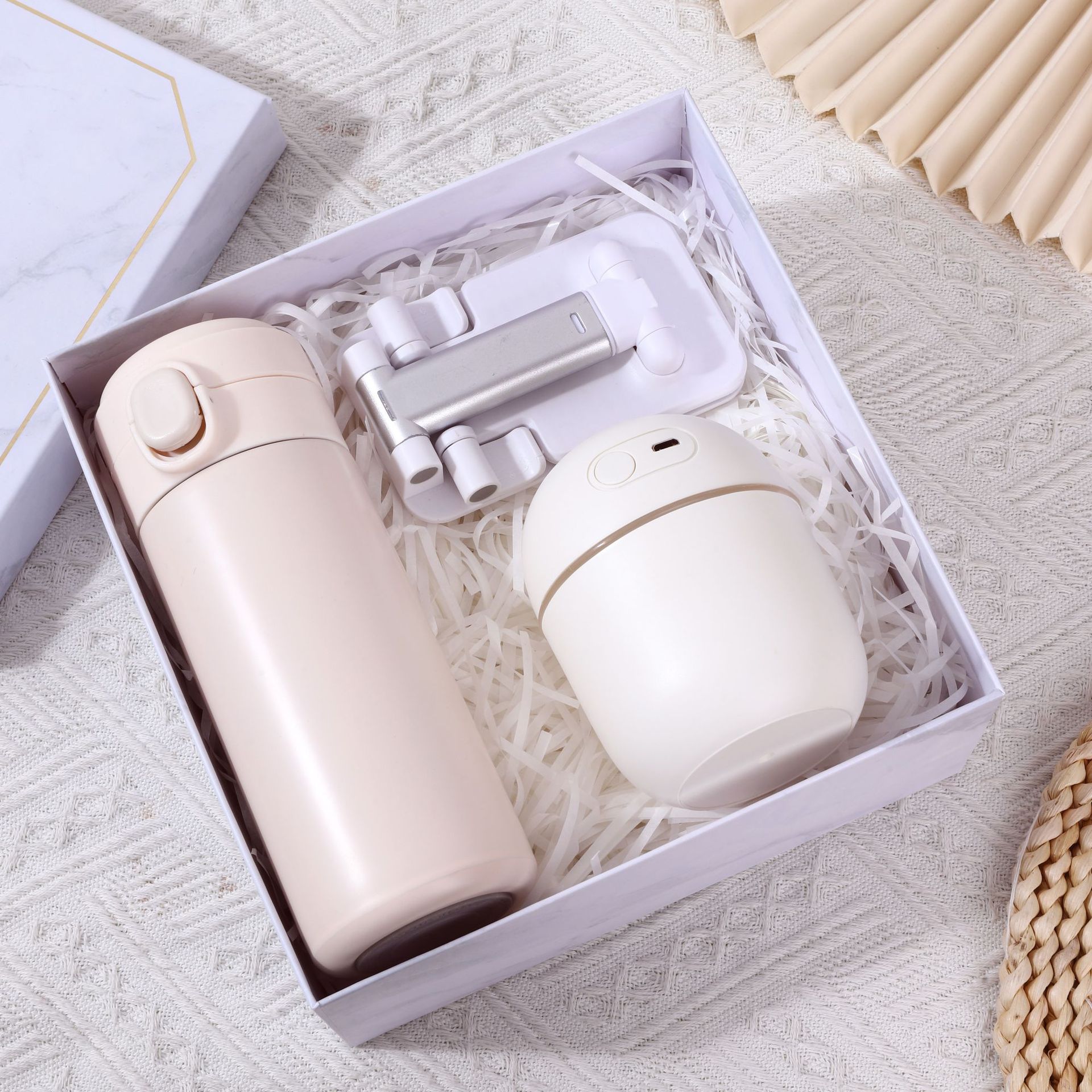 [white] thermos cup + umbrella + fan