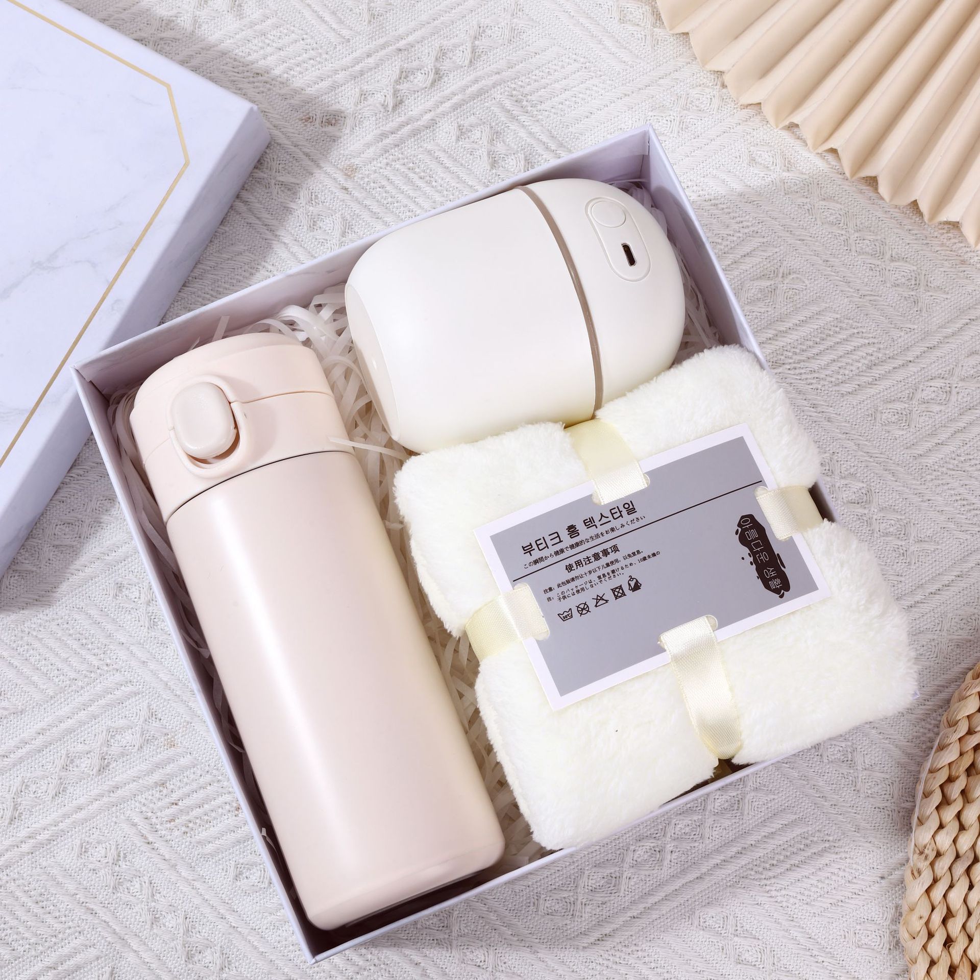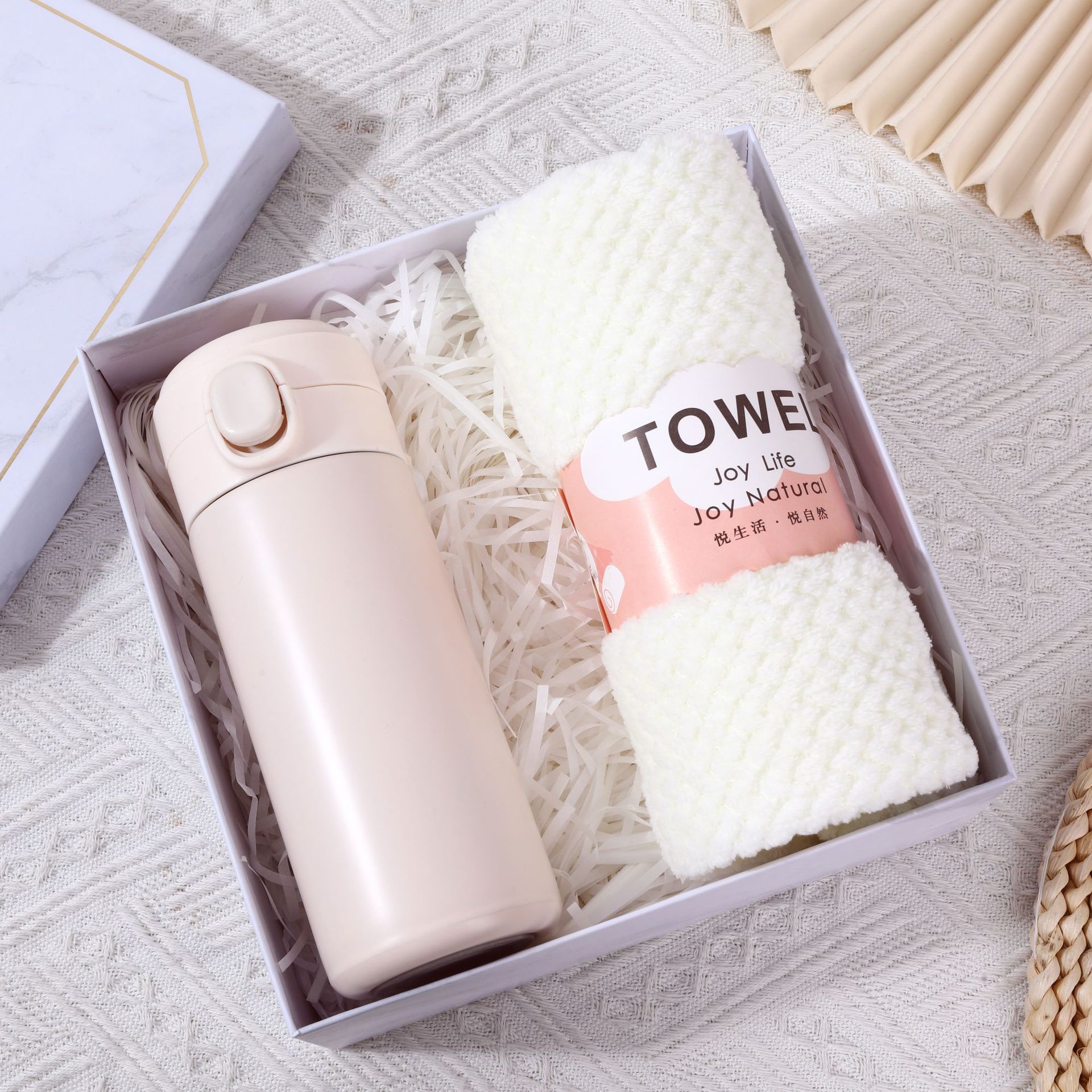 [white] thermos cup + soap + aromatherapy + towel