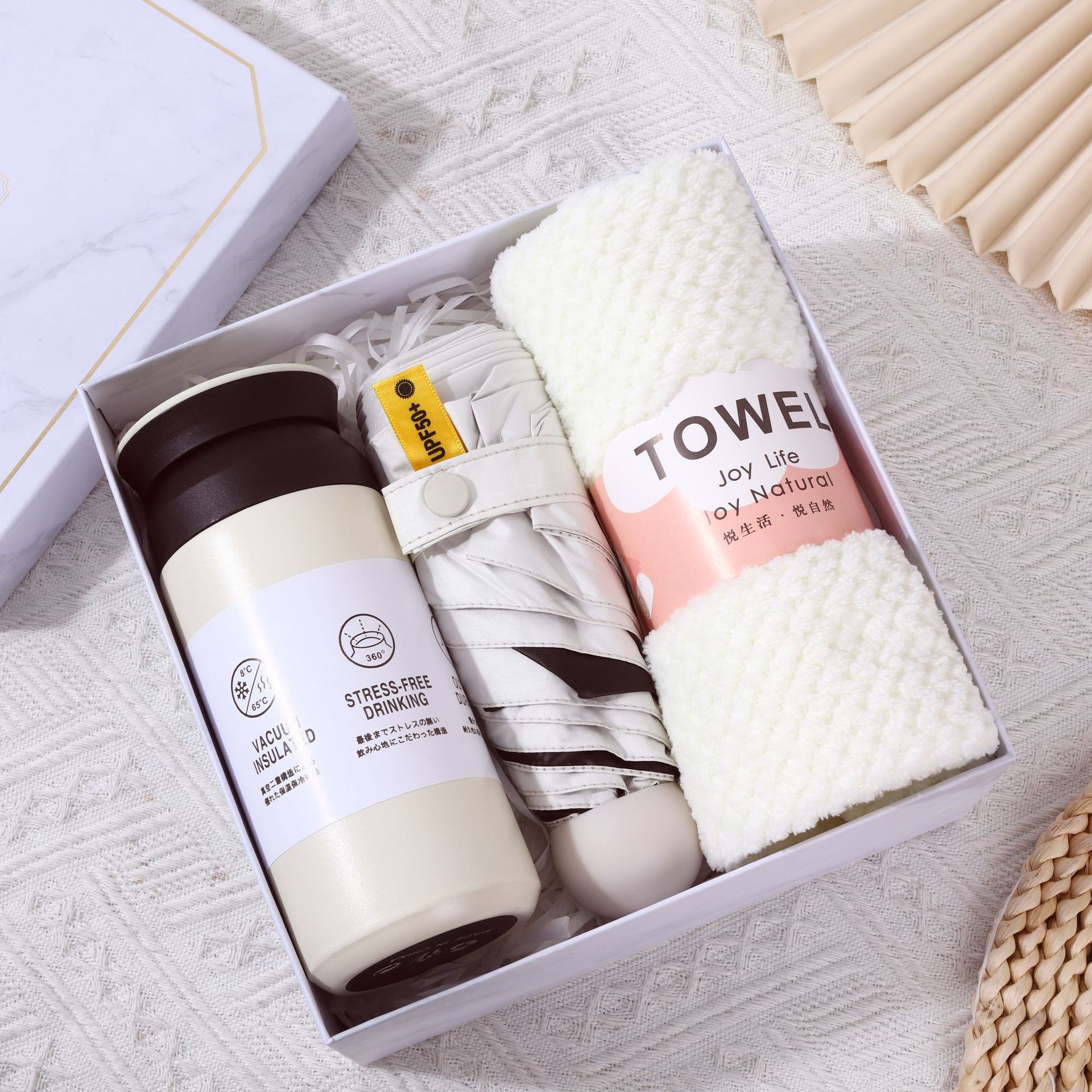 [white] warm insulation cup + umbrella + towel