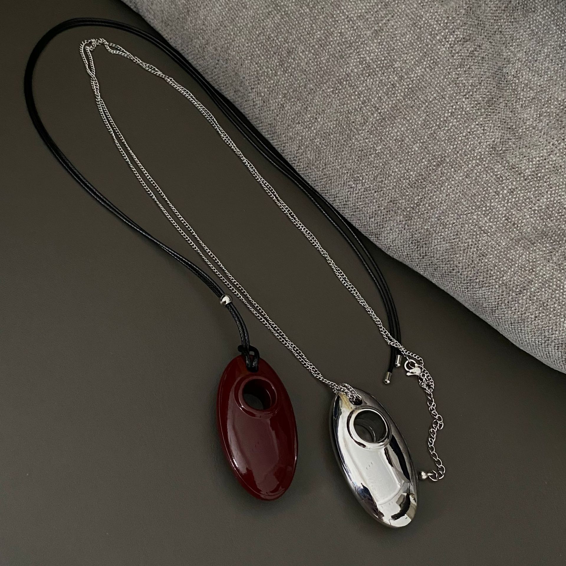 wine red metal oval black rope necklace