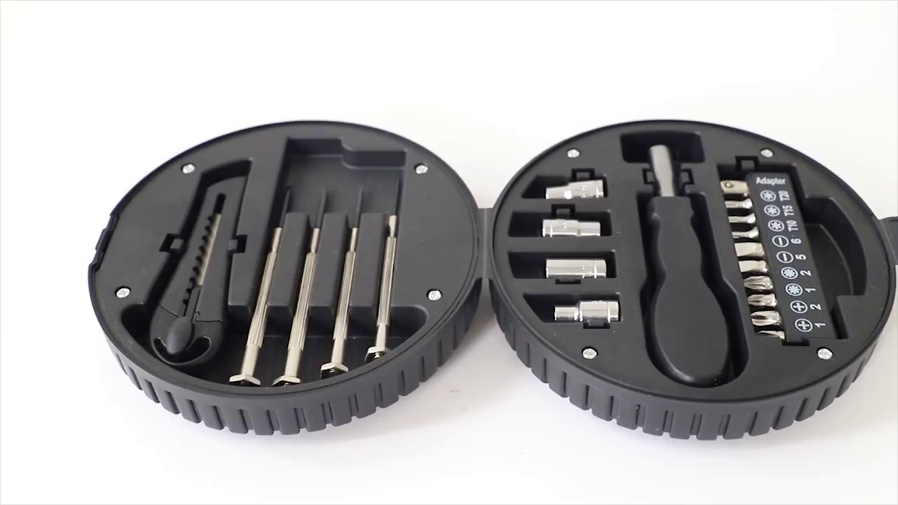 313g tire shape tool set, the internal tools are: 5mm,6mm,7mm,8mm size 4pc sleeve, 10pc screwdriver head, 1pc gourd handle, 4PCs clock screwdriver, 1pc art knife.