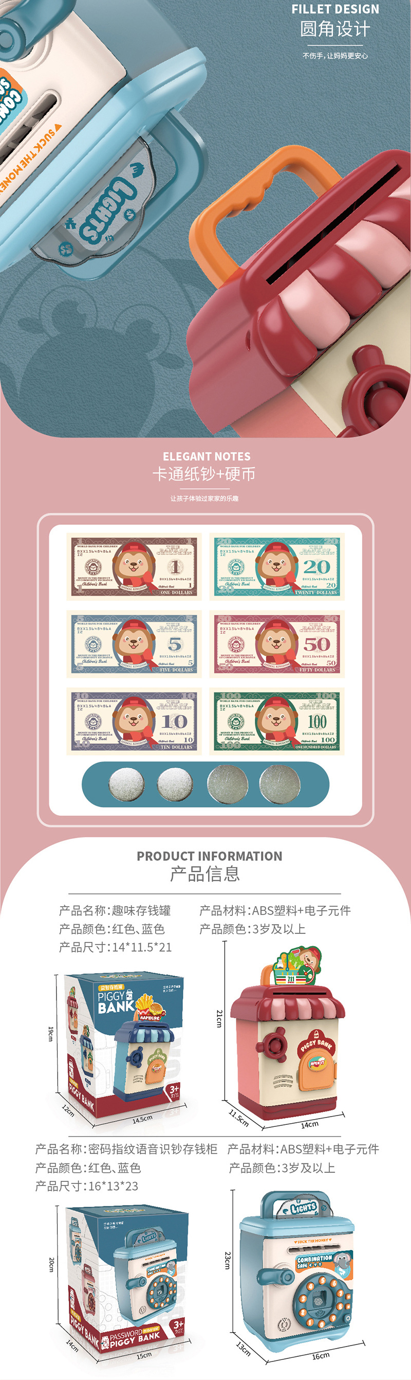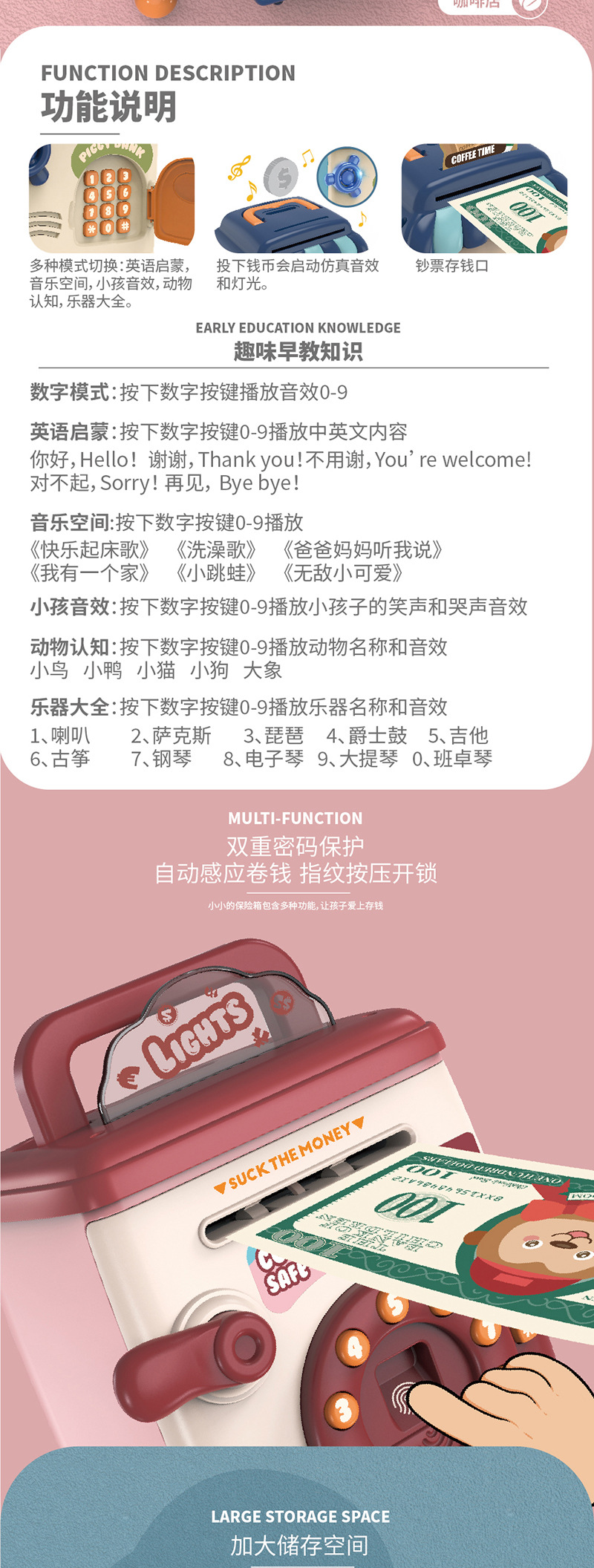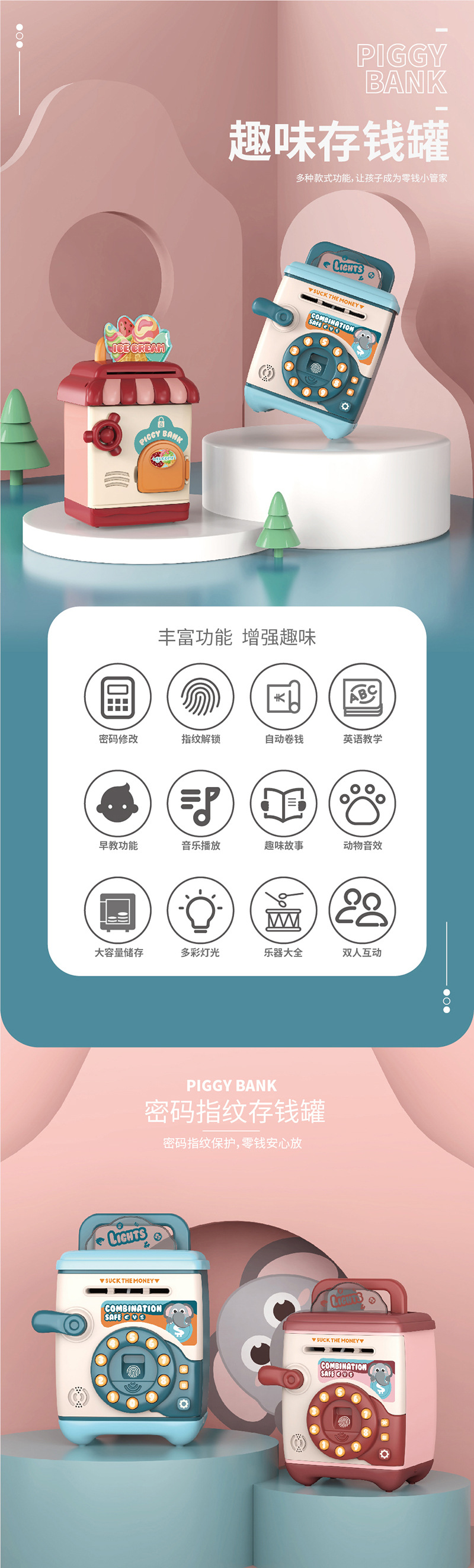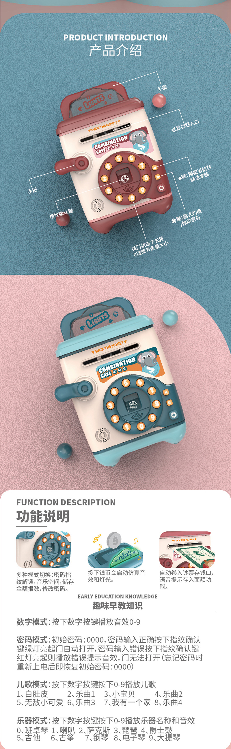 fingerprint password voice recognition money deposit cash box (pink)