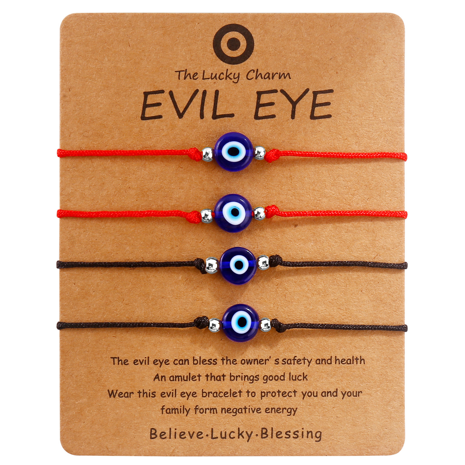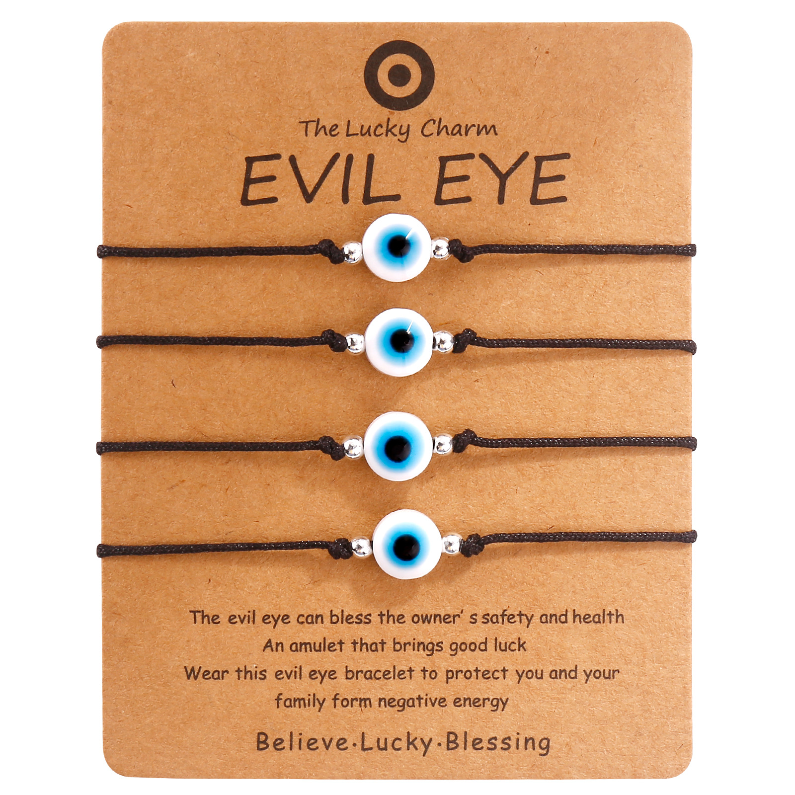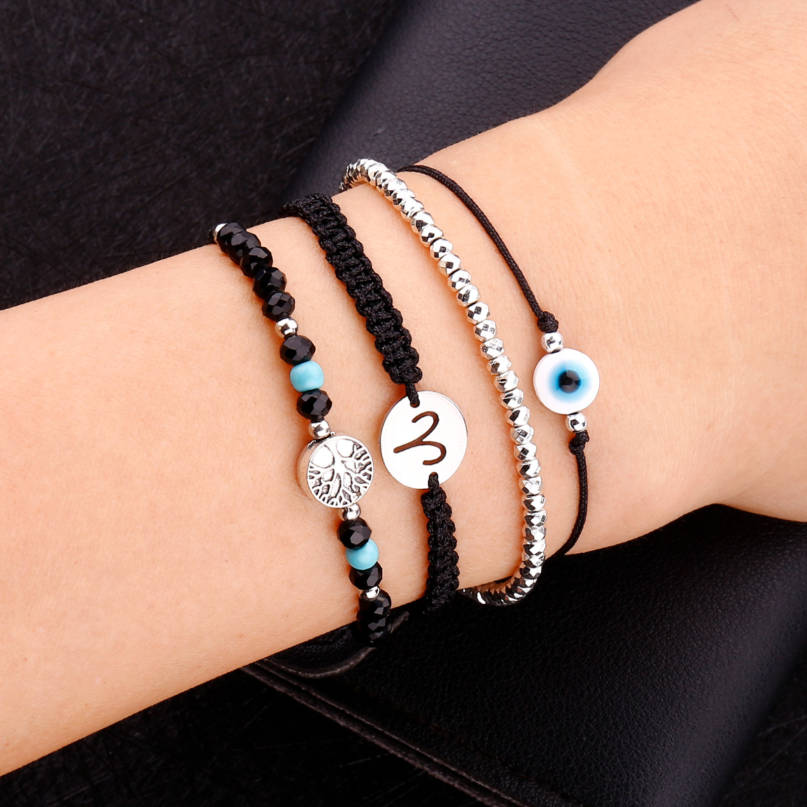 4 black rope sliver beads blue eyes