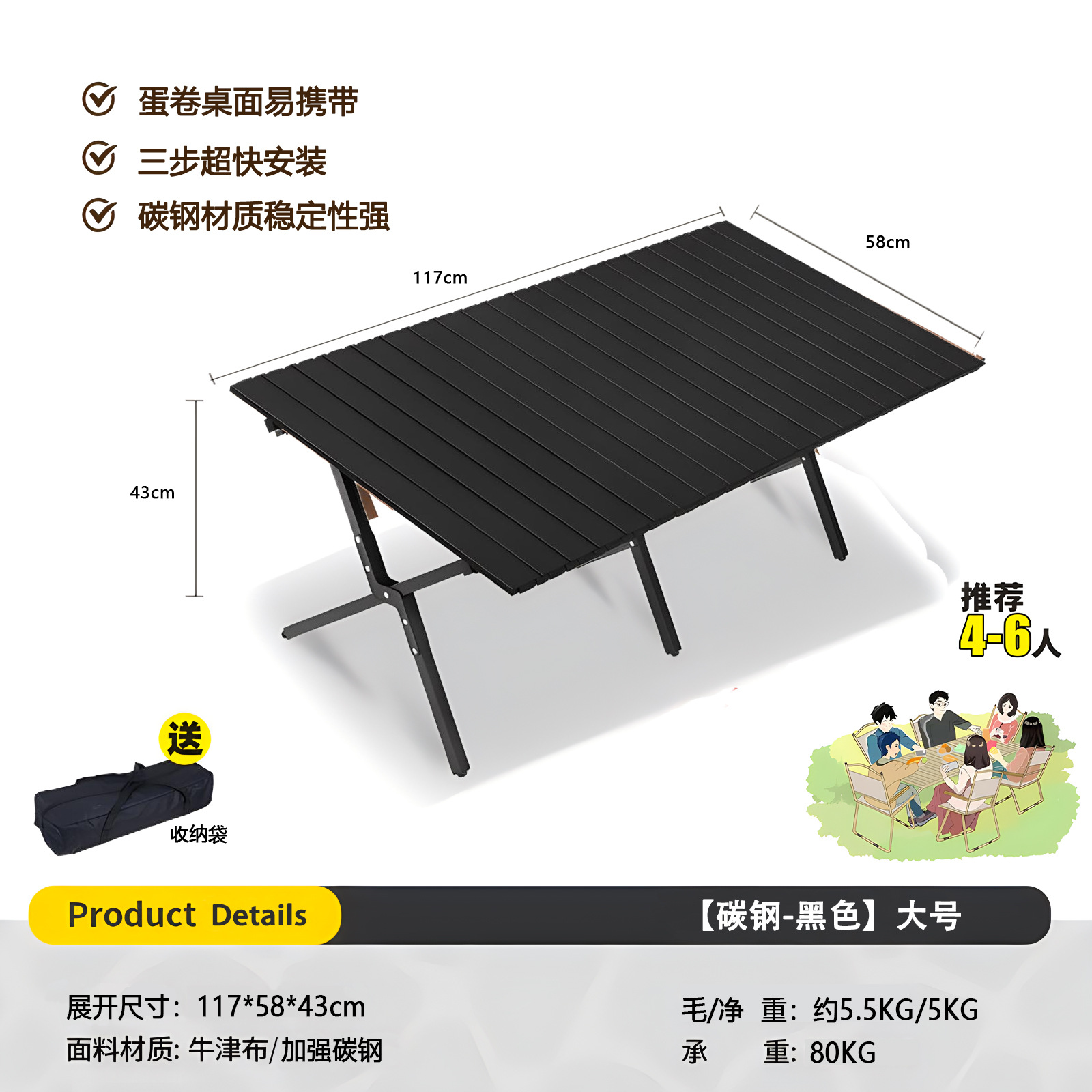 [carbon steel + black] 120cm large egg roll table