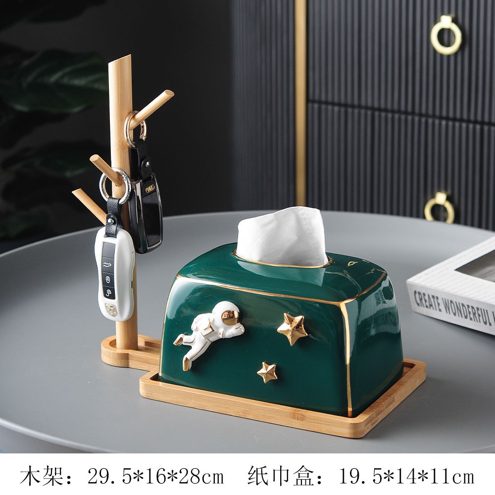 green tissue box + wooden rack