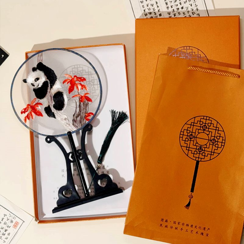 circular fan maple leaf panda + small fan frame + gift gift bag