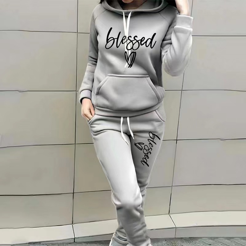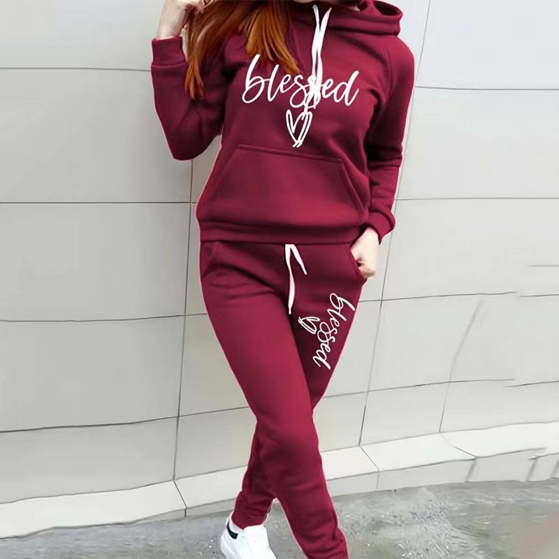 foreign trade women's sweater suit heart letter printing ladies leisure sports suit hooded fashion fleece sweater suit