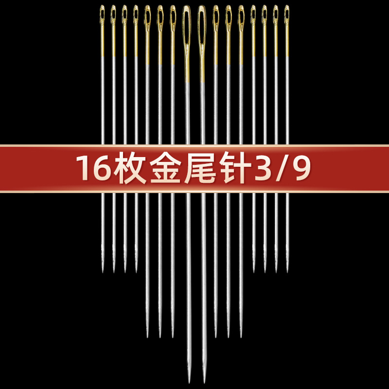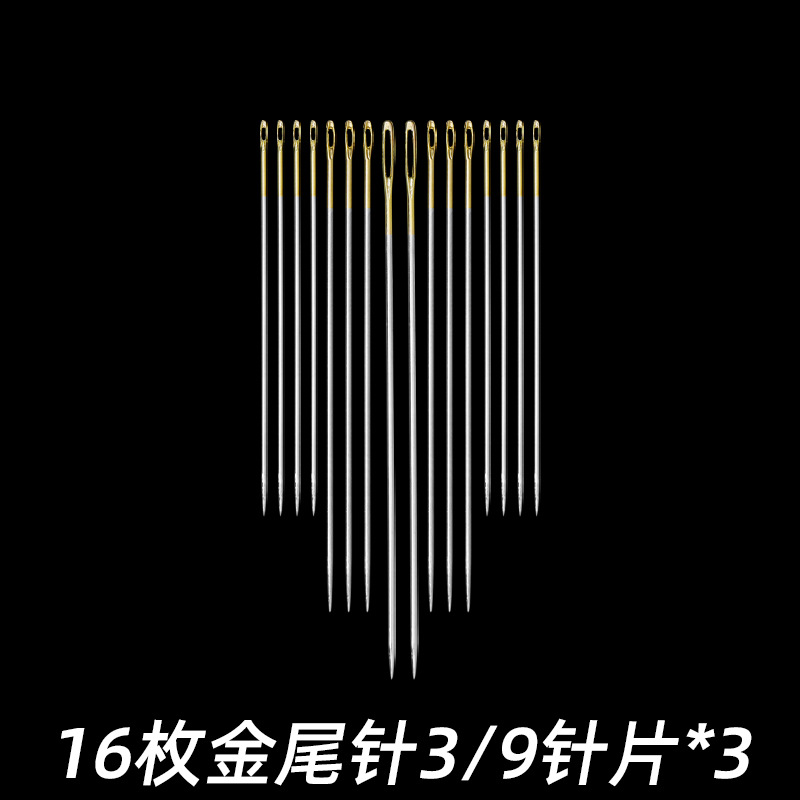 16 gold tail needles + pear flower and wood needles + thimble + needle-threader