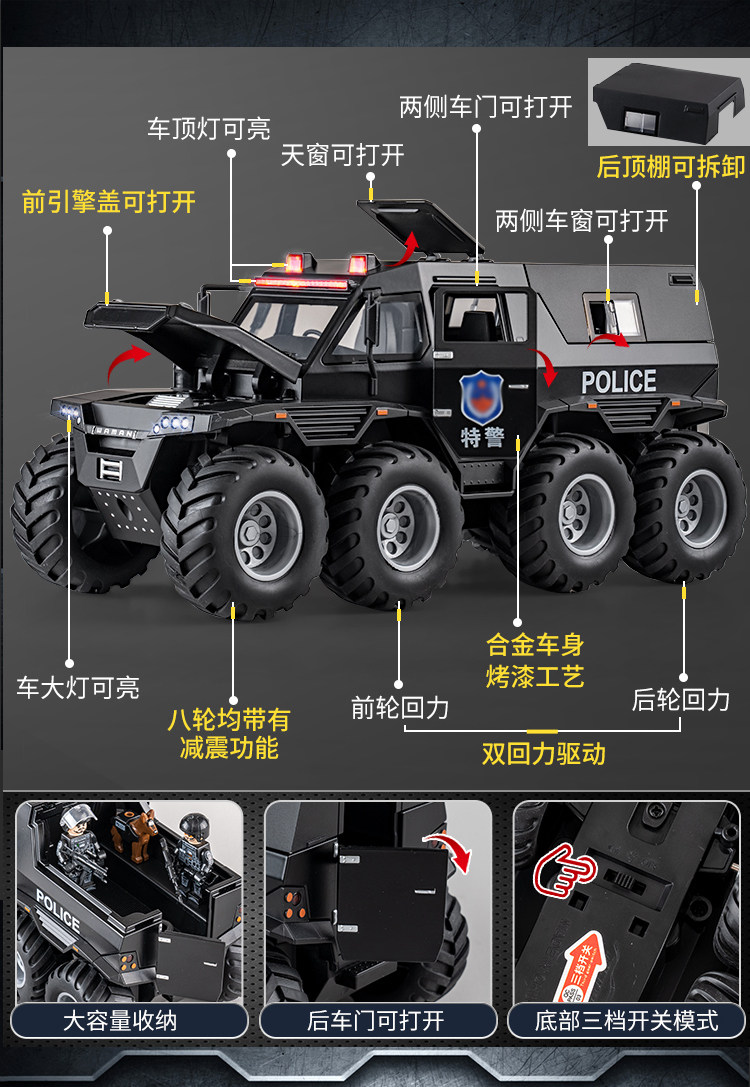 [oversized alloy] conqueror eight-wheeled off-road vehicle [special police black] +3 assembled special police doll