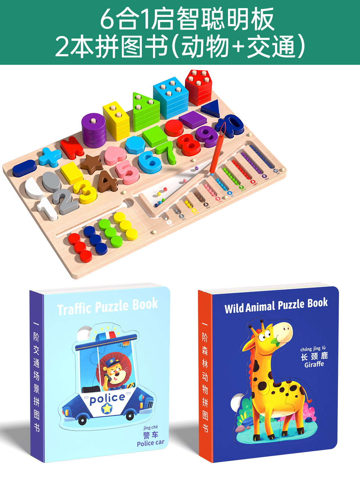 six-in-one montessori smart board +2 puzzle books (animal + traffic)
