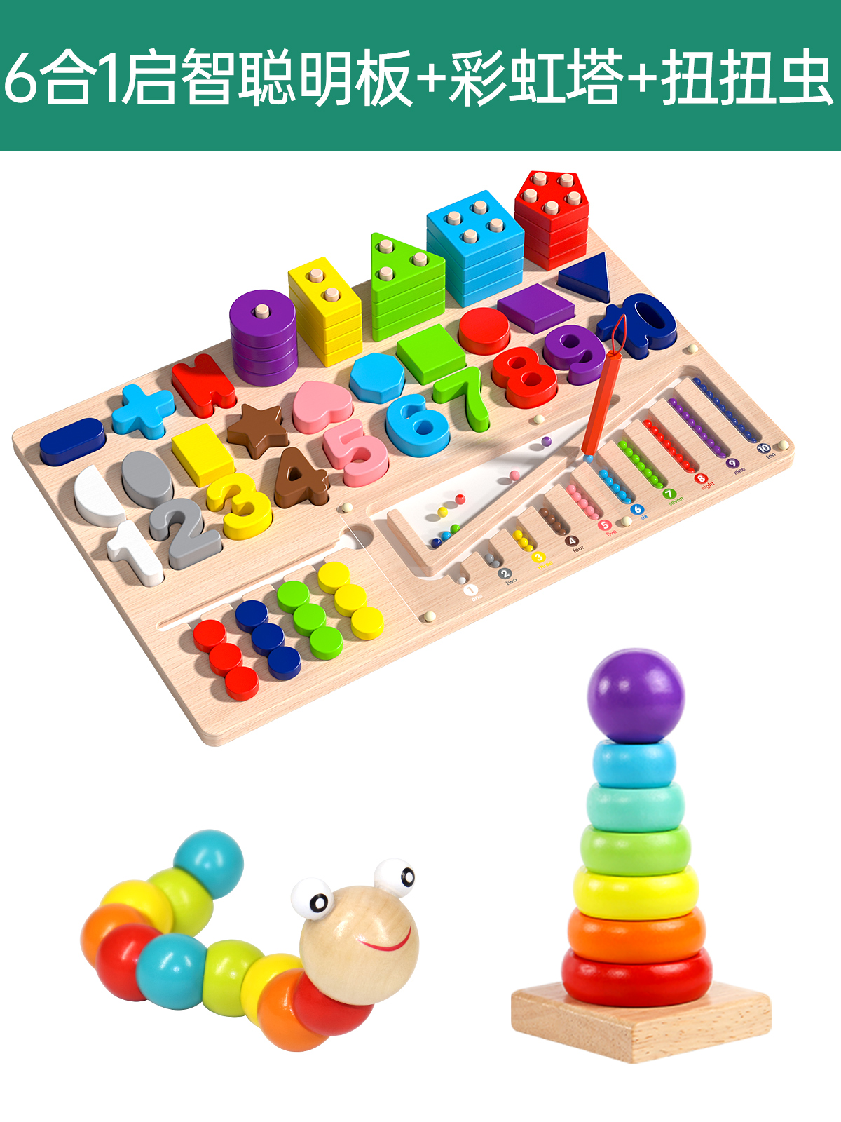 six-in-one montessori smart board + rainbow tower + toy worm
