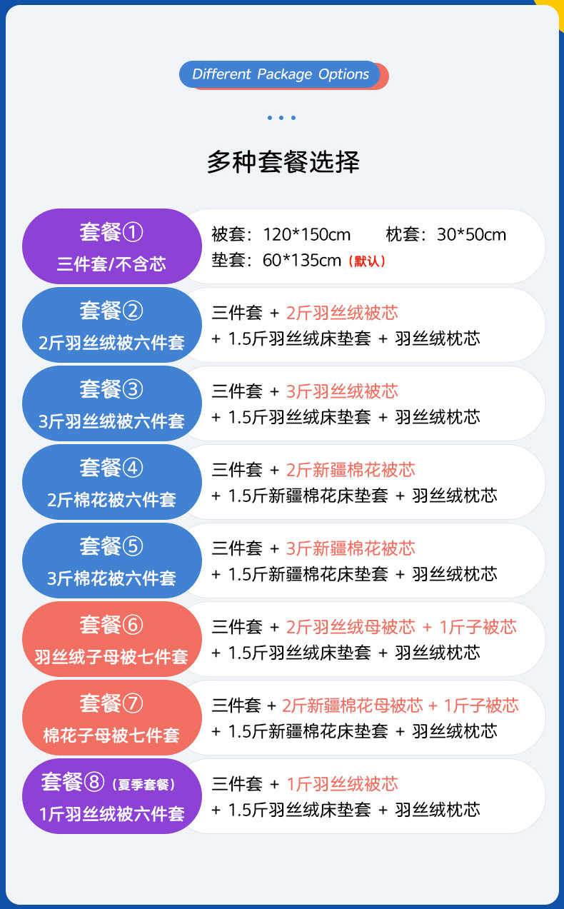 | package 3: six-piece set in winter [three-piece set + feather fabric comforter 1.50kg + cushion core + pillow core]] | CN¥ 200.0 | 1000 piece available |