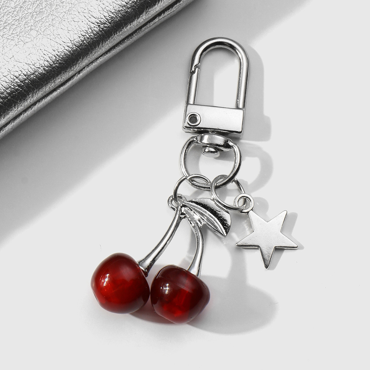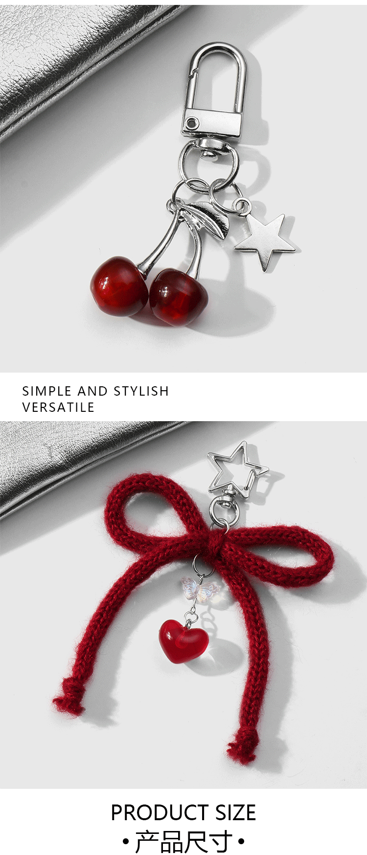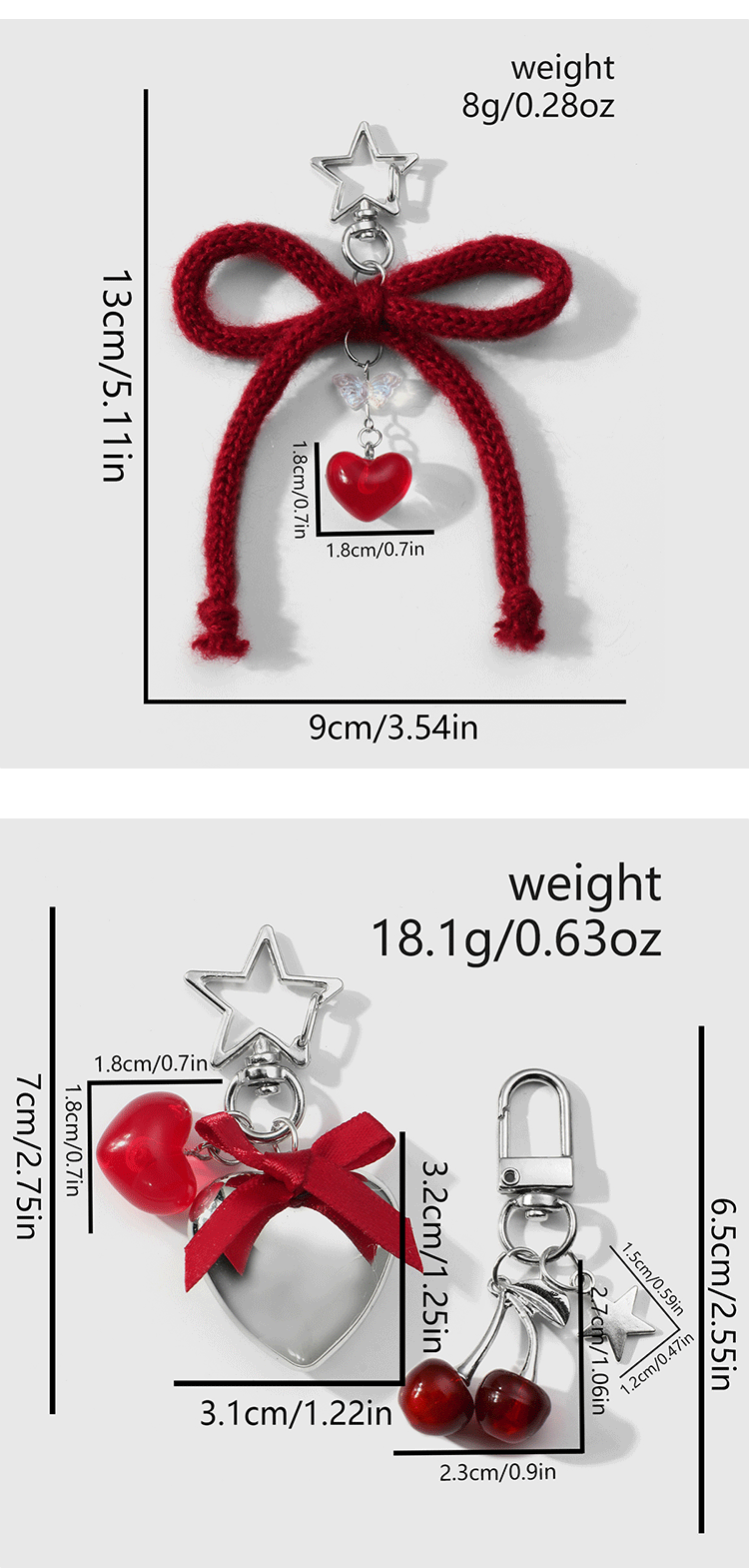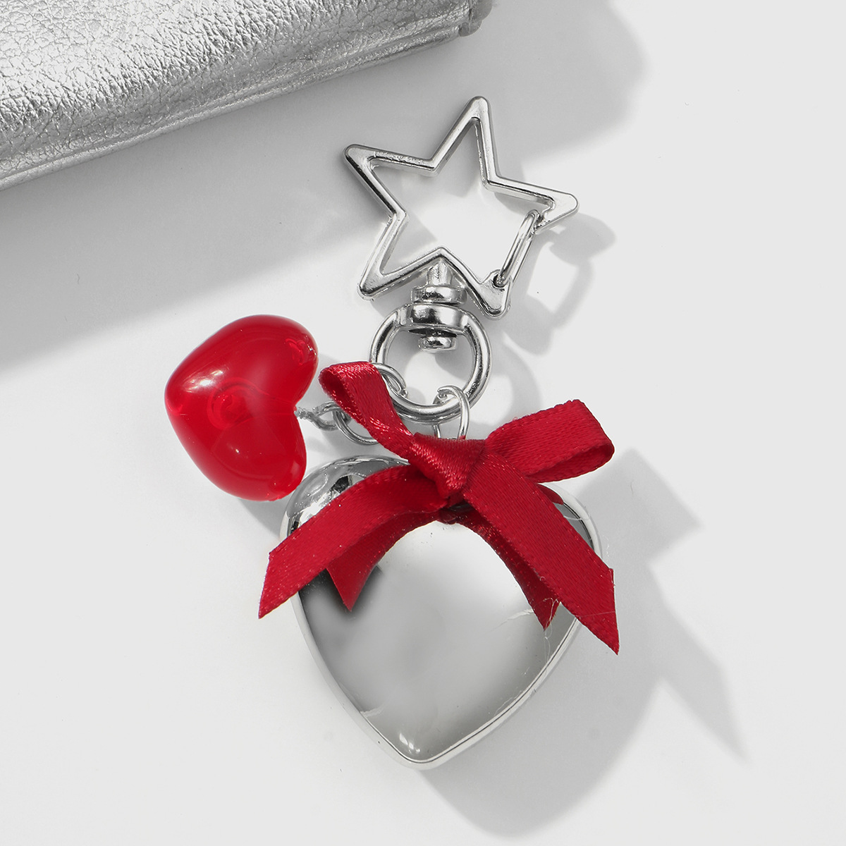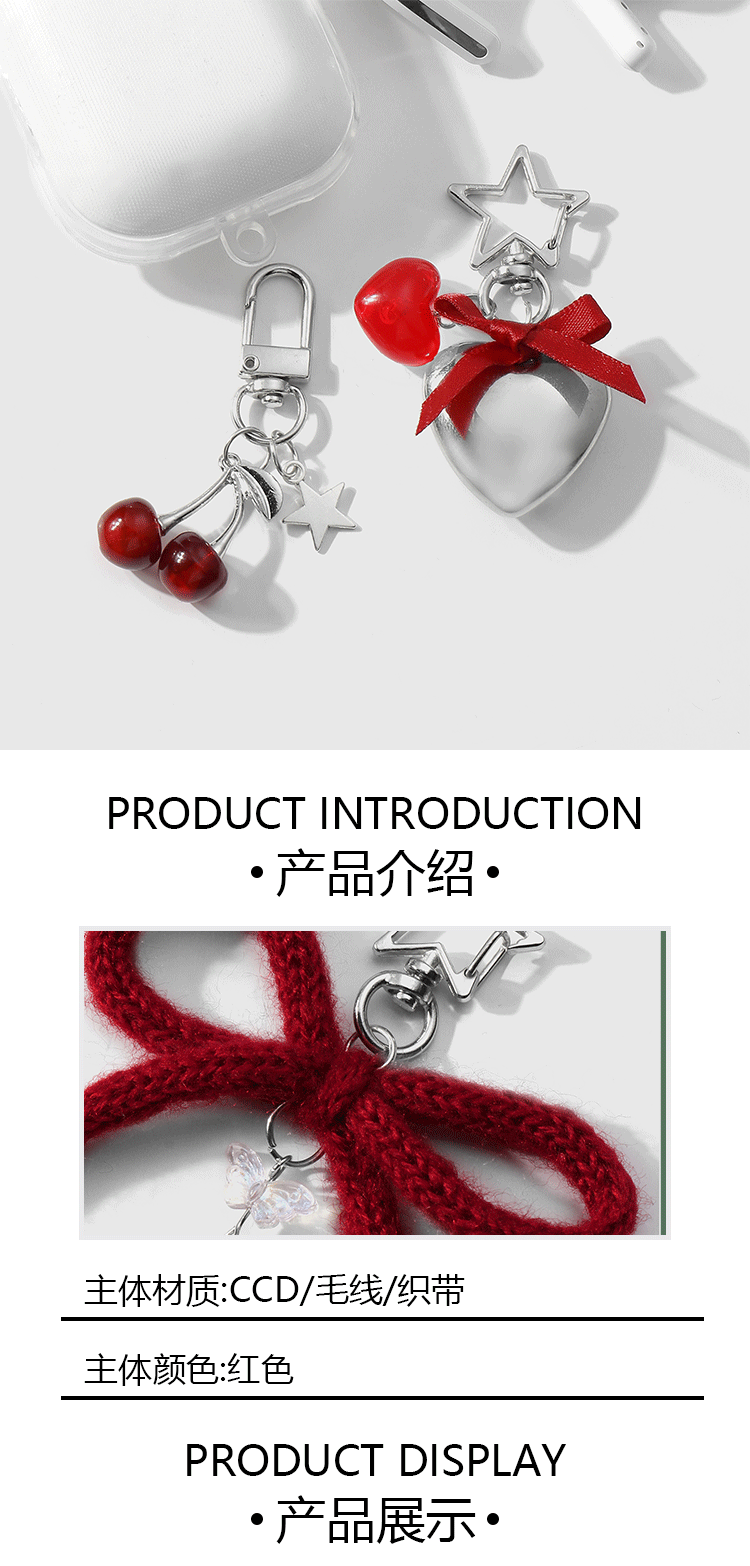 silver love heart + red cherry bow keychain suit 2