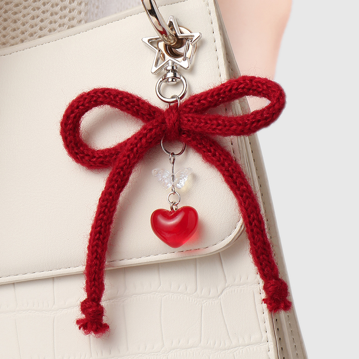 red wool bow heart keychain 1