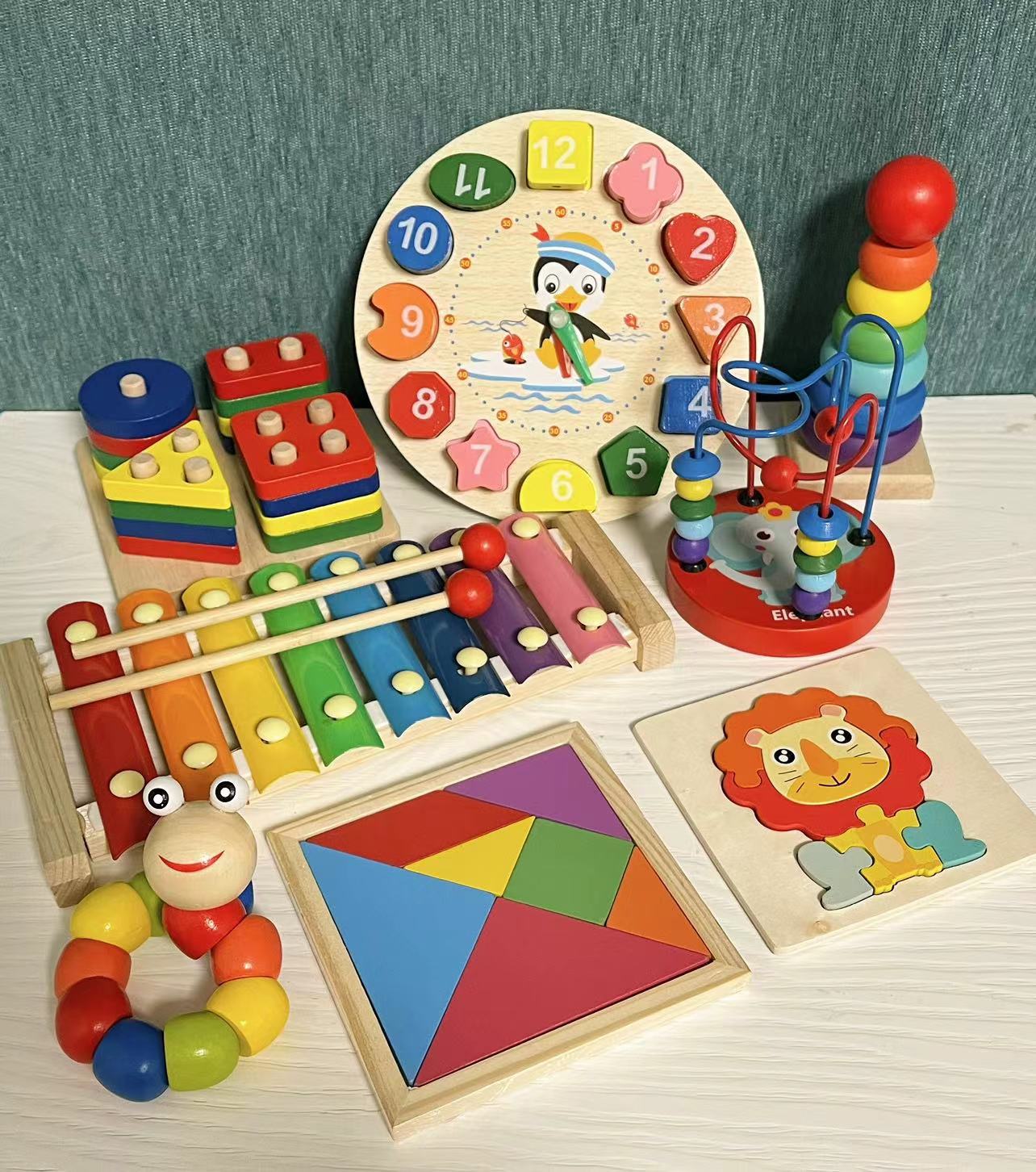 7-piece set [rainbow tower + toy worm + small bead-stringing toy + four sets of pillars + music box + beaded clock + jigsaw puzzle]]