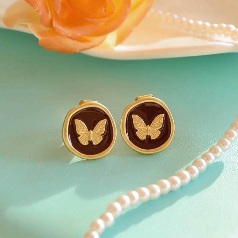 1 gold butterfly brown stud earrings-