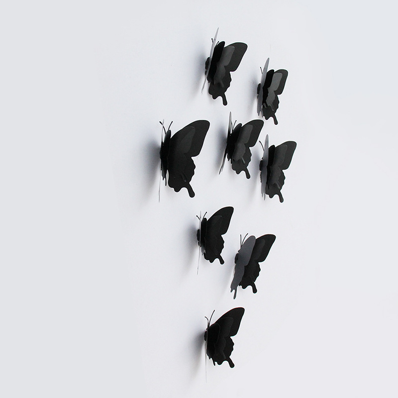 黑色双层凤尾蝶 12只装,尺寸为7公分双层4只,8公分双层4只 15公分双层2只,18公分双层2只。OPP袋包装。暗黑系列,万圣节派对装饰,场景布置,拍摄道具。 可用附件:磁铁+粘胶、别针或者夹子。可以根据自己的需求选择附件,方便装饰。