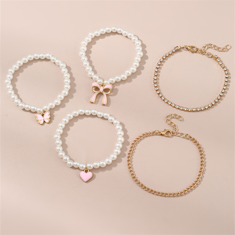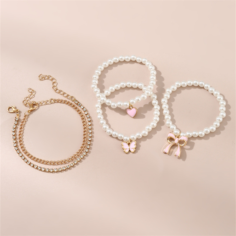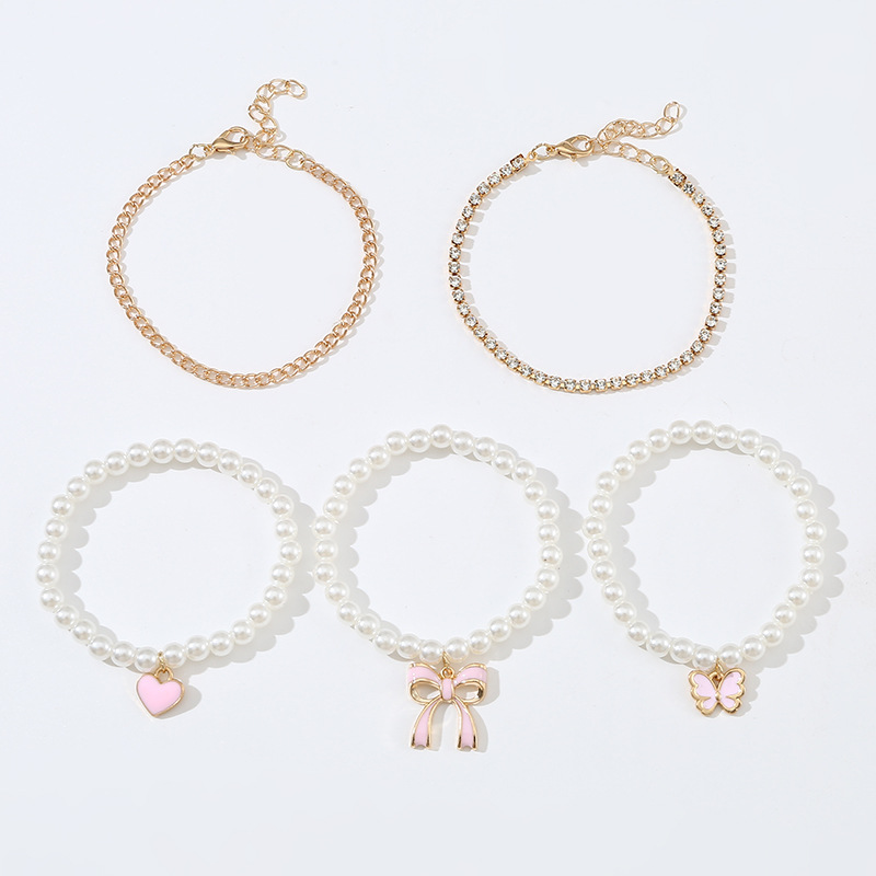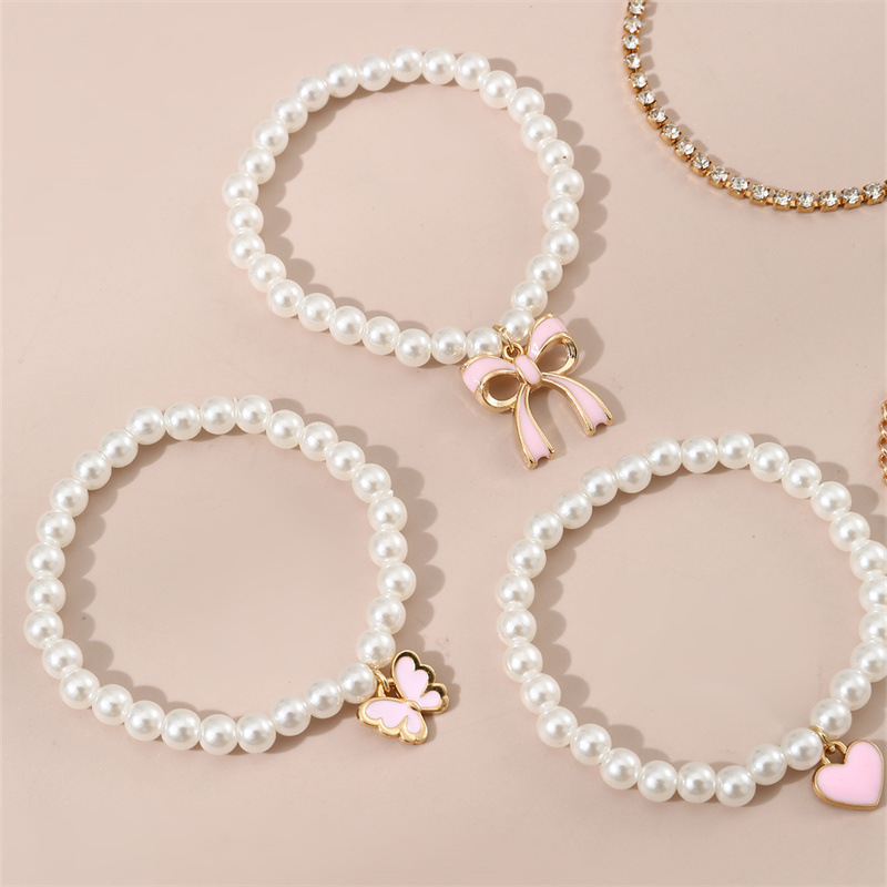 sweet simple pink bow love pendant pearl handmade beaded cross-border children's bracelet 6 pieces suit