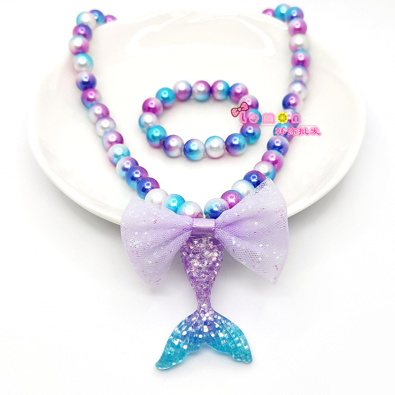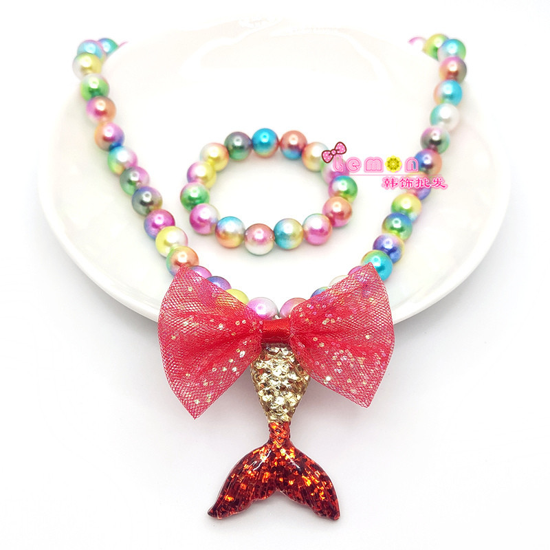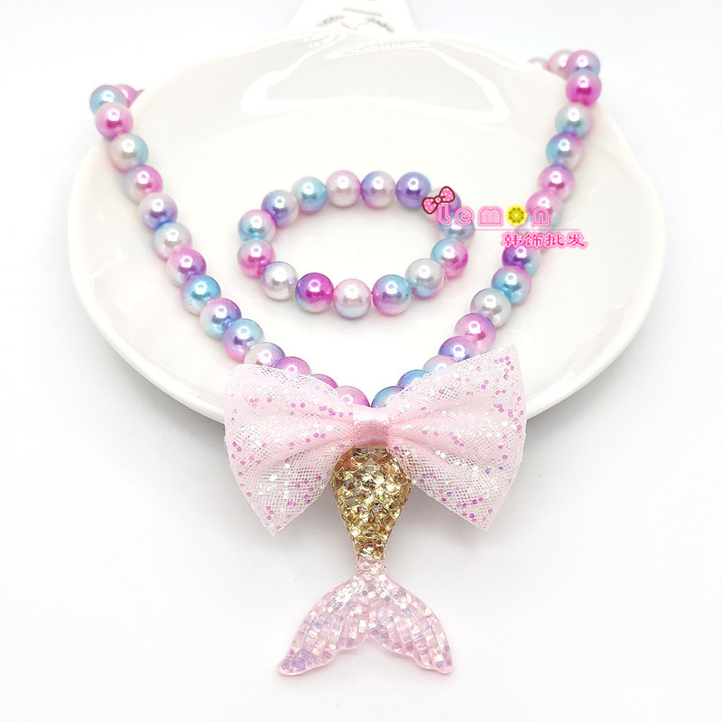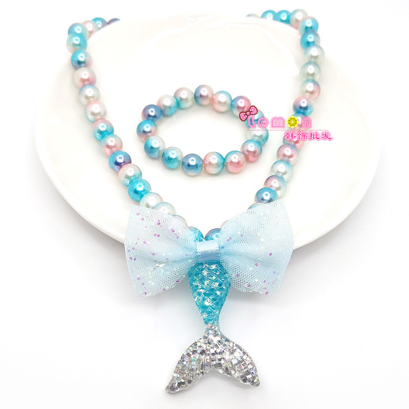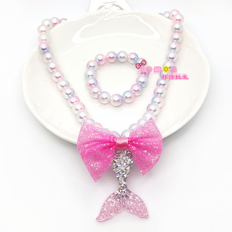 new mermaid tail pendant children's pearl necklace bracelet women's set shiny scale bow jewelry