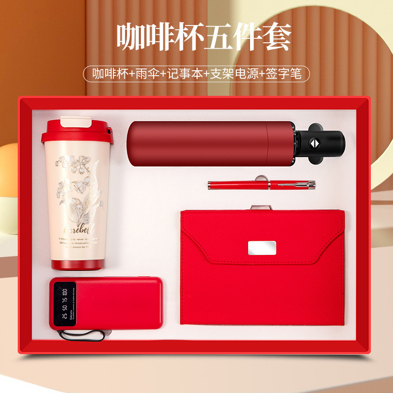 linglan cup + notebook + signature pen + power bank + umbrella/red five-piece set