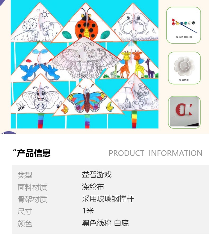 | 1.15 m color filling kite mixed hair +30 m line + six color paint + brush + palette | CN¥ 4.2 | 100000 piece available |