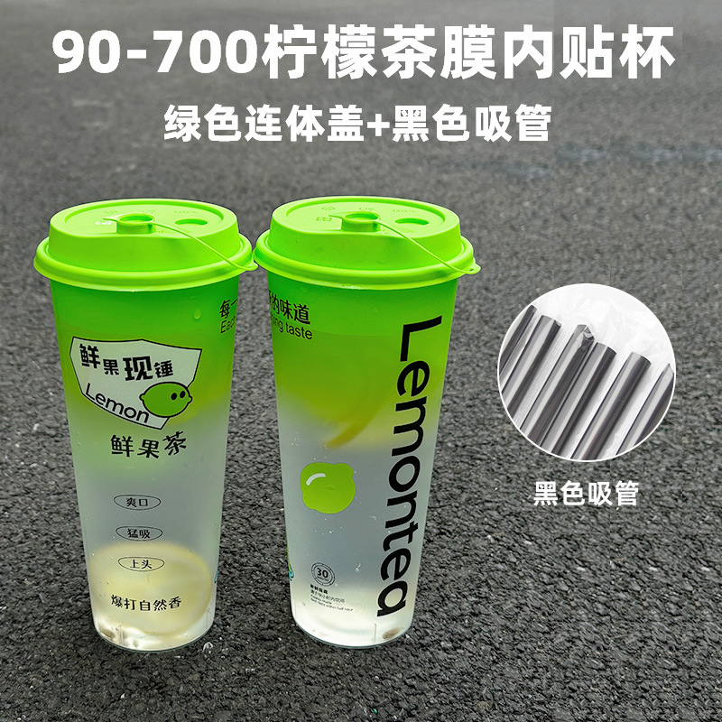 90-700ml lemon film inner stick cup + green one-piece cover + thin straw