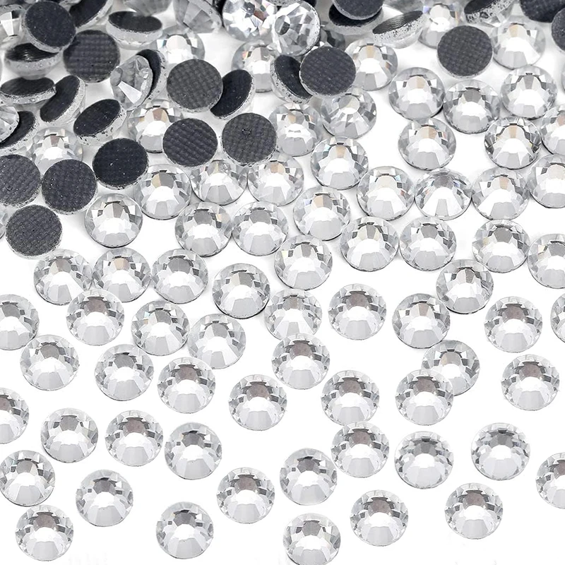 Glass rhinestones include a lower ratio of lead oxide. The glass itself is transparent. A layer of metal coating is placed onto the backside of the stones so light is able to reflect and make rhinestones shine like a diamond. High-quality glass rhinestones are a great alternative to crystal rhinestones with similar shine and lower cost.
