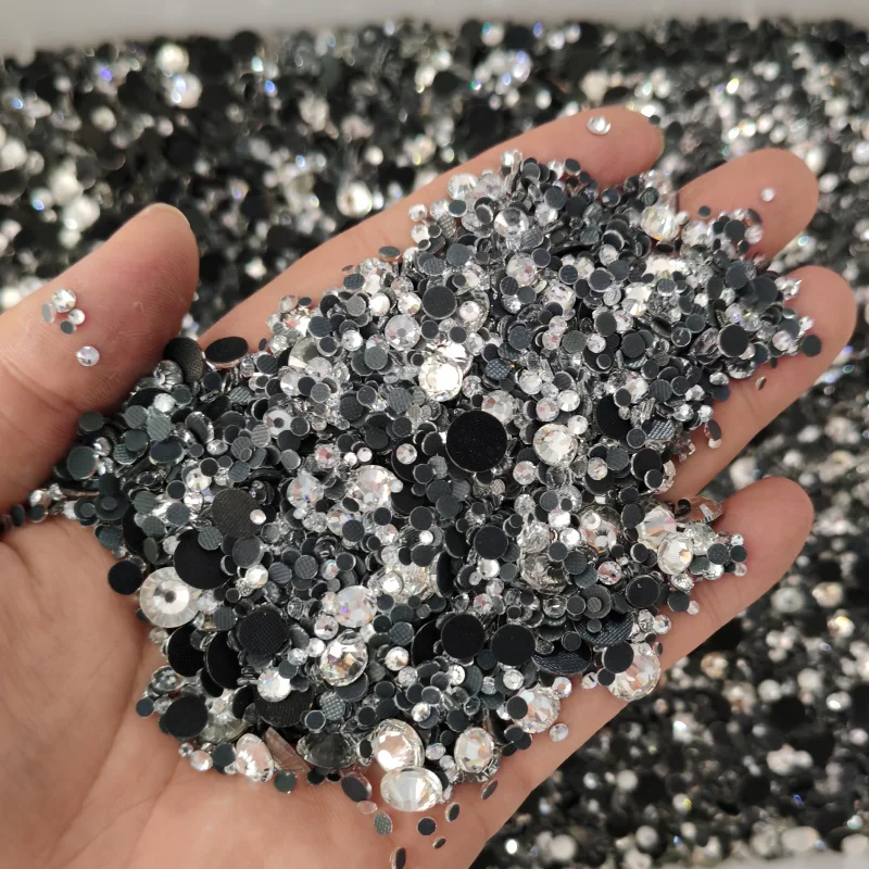 Glass rhinestones include a lower ratio of lead oxide. The glass itself is transparent. A layer of metal coating is placed onto the backside of the stones so light is able to reflect and make rhinestones shine like a diamond. High-quality glass rhinestones are a great alternative to crystal rhinestones with similar shine and lower cost.