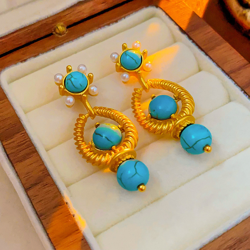 silver needle hollow turquoise metal water drop earrings