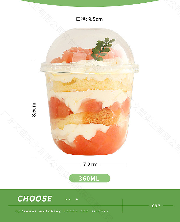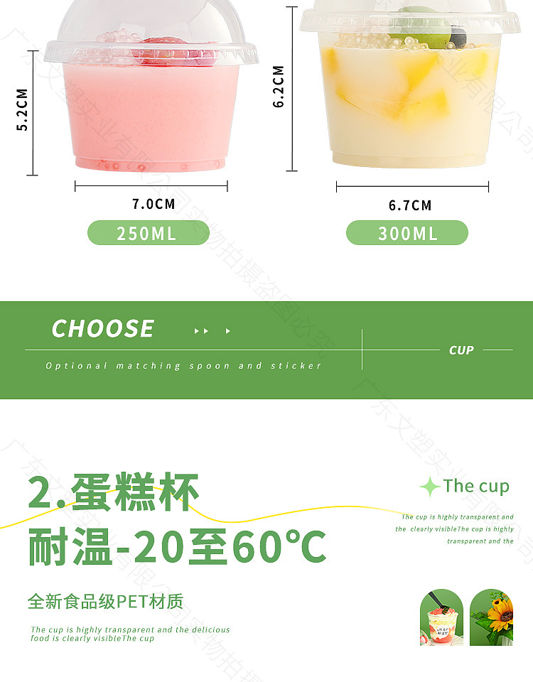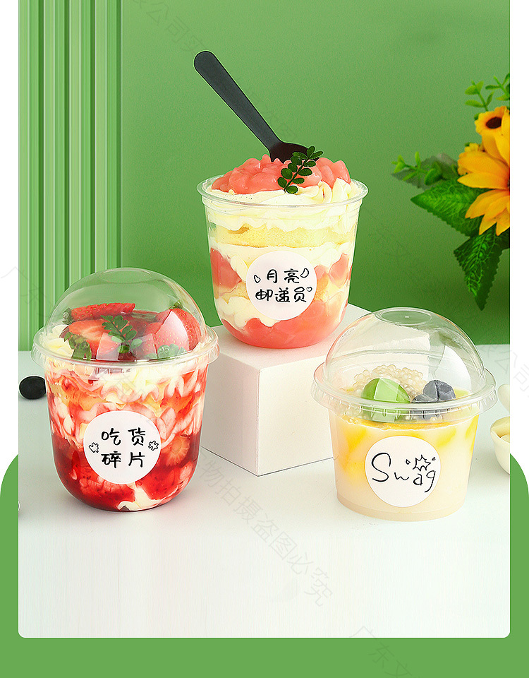 300ml flat bottom pudding cup 1000 pieces; non-porous semicircle cover + black spoon with stickers