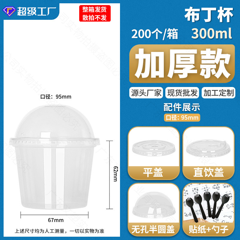 300ml flat bottom pudding cup 200 pieces; non-porous semicircle cover + black spoon with stickers