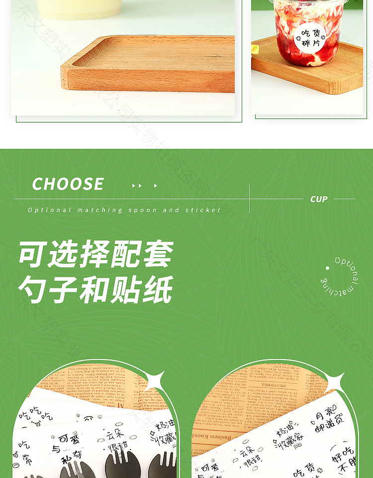 250ml flat bottom pudding cup 500 pieces; straight drink cap + black spoon with stickers