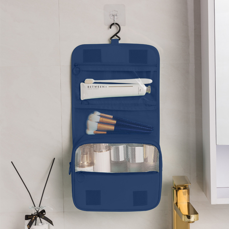 navy blue twill toiletry bag hung with hook