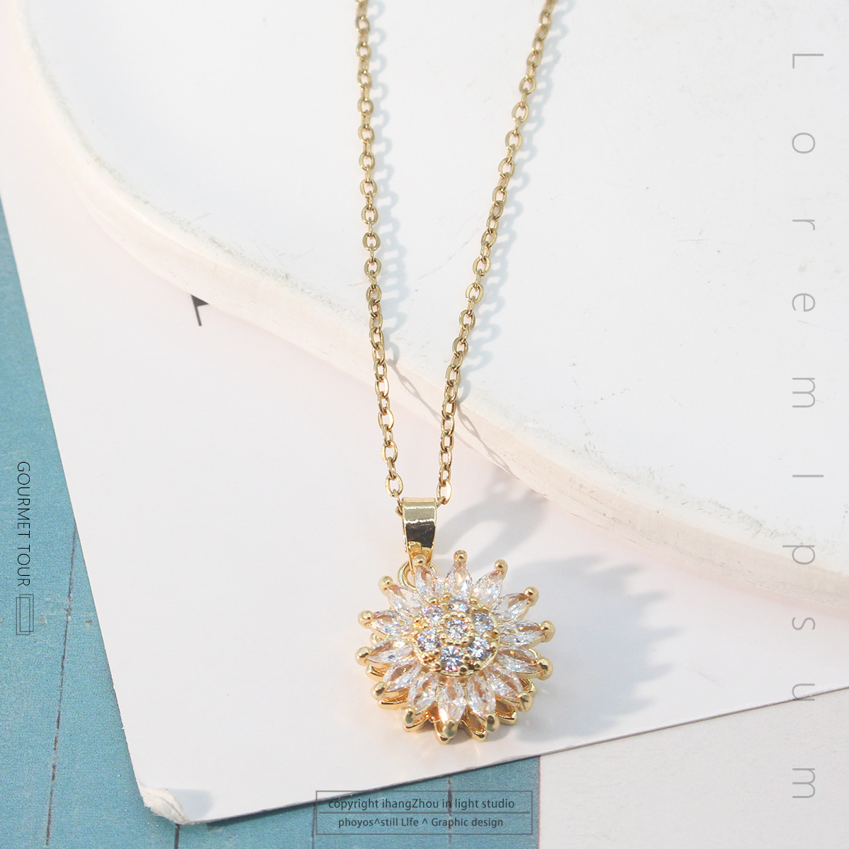 xl611 rotating multi-petal flower necklace gold