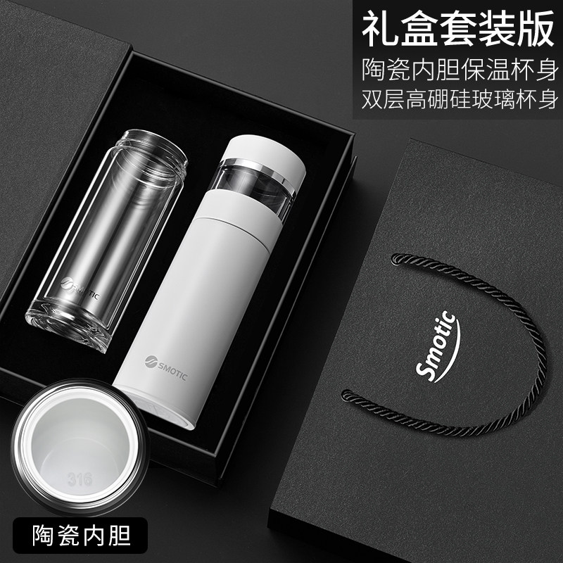 [elegant white-enjoy suit] ceramic inner pot thermos cup + double layer glass cup