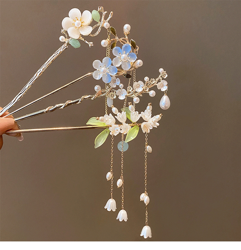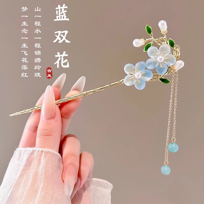 21# plum blossom light blue single pearl flower tassel hairpin (bag