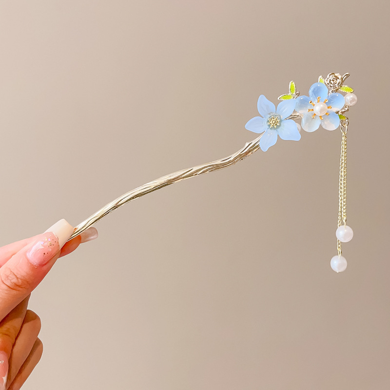 21# plum blossom light blue single pearl flower tassel hairpin (bag