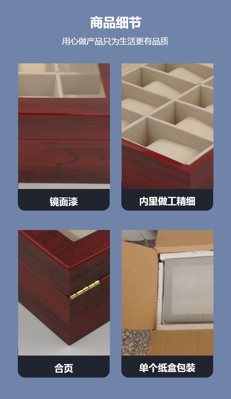 Wholesale watch boxes, wooden watch cases, watch storage boxes, 6-slot jewelry display boxes for wristwatches, and wooden storage boxes for collection.